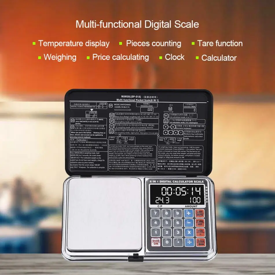 This multi-functional products has weighing function, clock, calculator, thermometer, tare, pieces counting and price calculating function. It is small in size, user-friendly and portable. High accuracy and sensitivity, great for jewelry, gold and medications weighing.