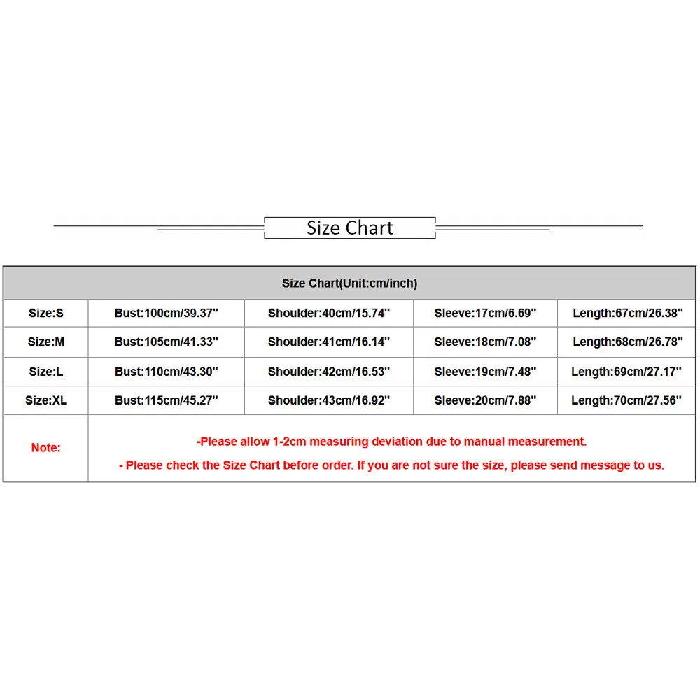 Size:XL Bust:115cm/45.27″ Shoulder:43cm/16.92″ Sleeve:20cm/7.88″ Length:70cm/27.56″