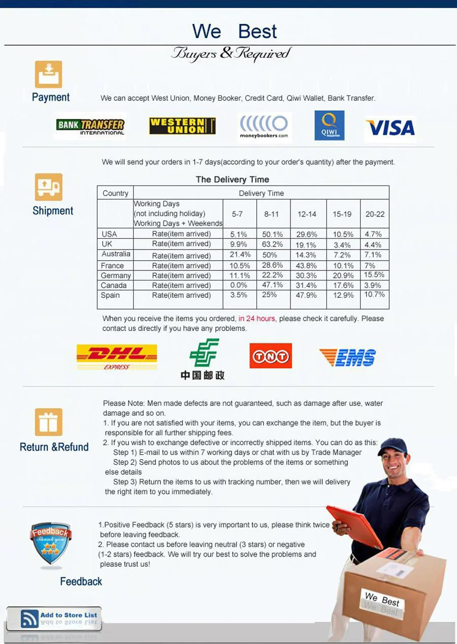 2)If you need the products urgently,please choose DHL,EMS, or the other express and pay for the shipping cost.