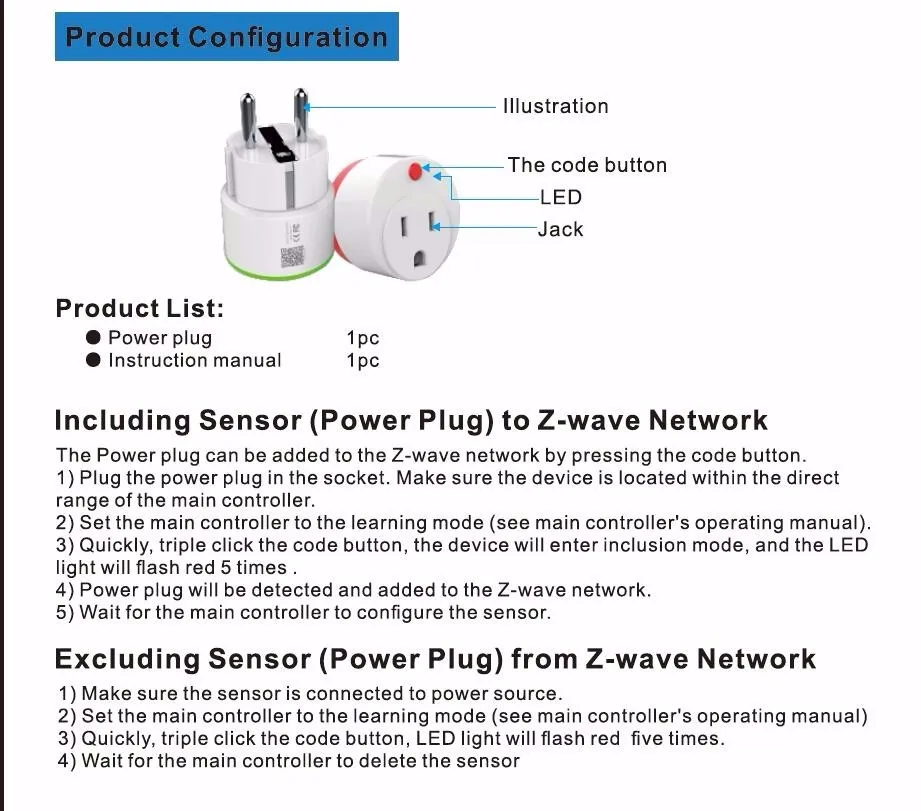Power plug is an intelligent device that can be controlled remotely by the Z-wave network which have particular frequency.in the Z-wave network communitcaions,power plug can be connected to any z-wave main controller.Different countries or areas.the radio frequency is different of the z-wave network.in the communication with z-wave main controller,the power plug can send and receive messages.when press the code button of power plug.it will send messages to the z-wave main controller.the z-wave main controller can display the on/off status of power plug correctly.when the power plug receives messages from the z-wave main controller,the on/off status of the power plug can be switched remotely via mobile phone app.the power plug is small and light.very easy to operate