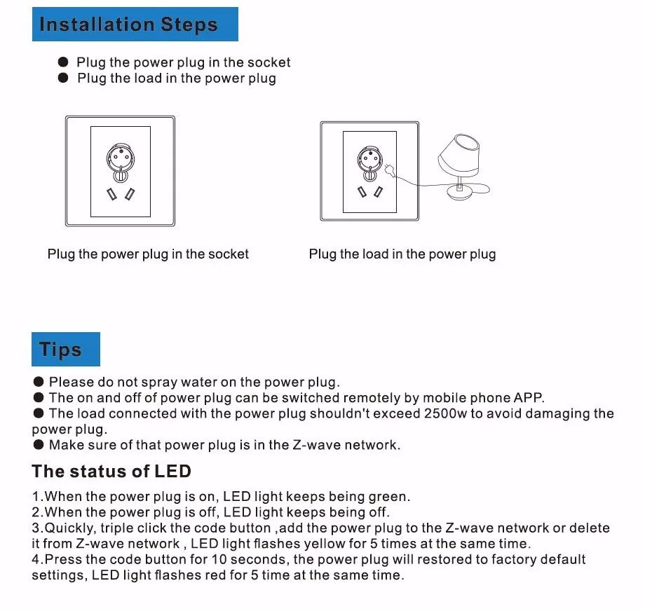 Power plug is an intelligent device that can be controlled remotely by the Z-wave network which have particular frequency.in the Z-wave network communitcaions,power plug can be connected to any z-wave main controller.Different countries or areas.the radio frequency is different of the z-wave network.in the communication with z-wave main controller,the power plug can send and receive messages.when press the code button of power plug.it will send messages to the z-wave main controller.the z-wave main controller can display the on/off status of power plug correctly.when the power plug receives messages from the z-wave main controller,the on/off status of the power plug can be switched remotely via mobile phone app.the power plug is small and light.very easy to operate