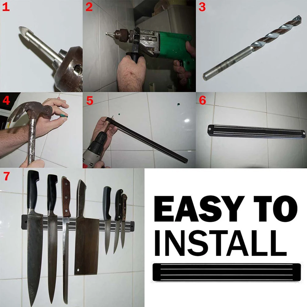 The magnetic storage strip can be affixed to any wall for immediate access. Stowing knives in drawers may lead to accidental cuts and scrapes to both user hands and other tools but the strip keeps knives visible and separated through the attraction between the magnet and the blade.