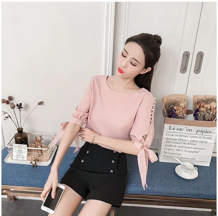 New 2018 Summer Pearl Sleeve Loose Women Blouses Shirt White Shirt Hollow Chiffon Shirt Small Fashion Cute Female Blusas 0359 40