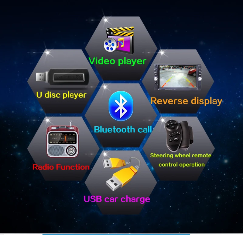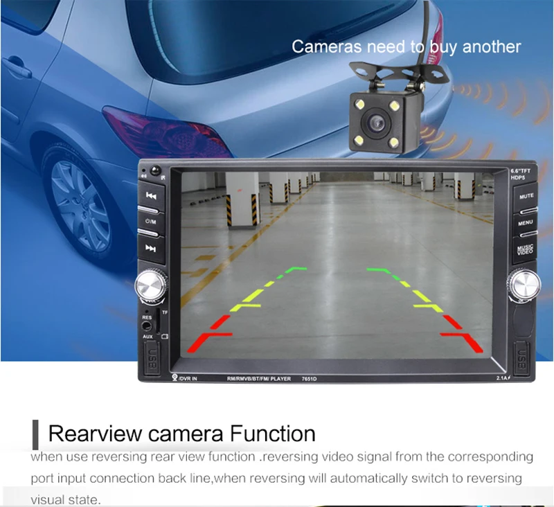 - Main function:MP5, USB/TF interface, FM, Bluetooth, included a rear view camera, rear camera input, Aux In