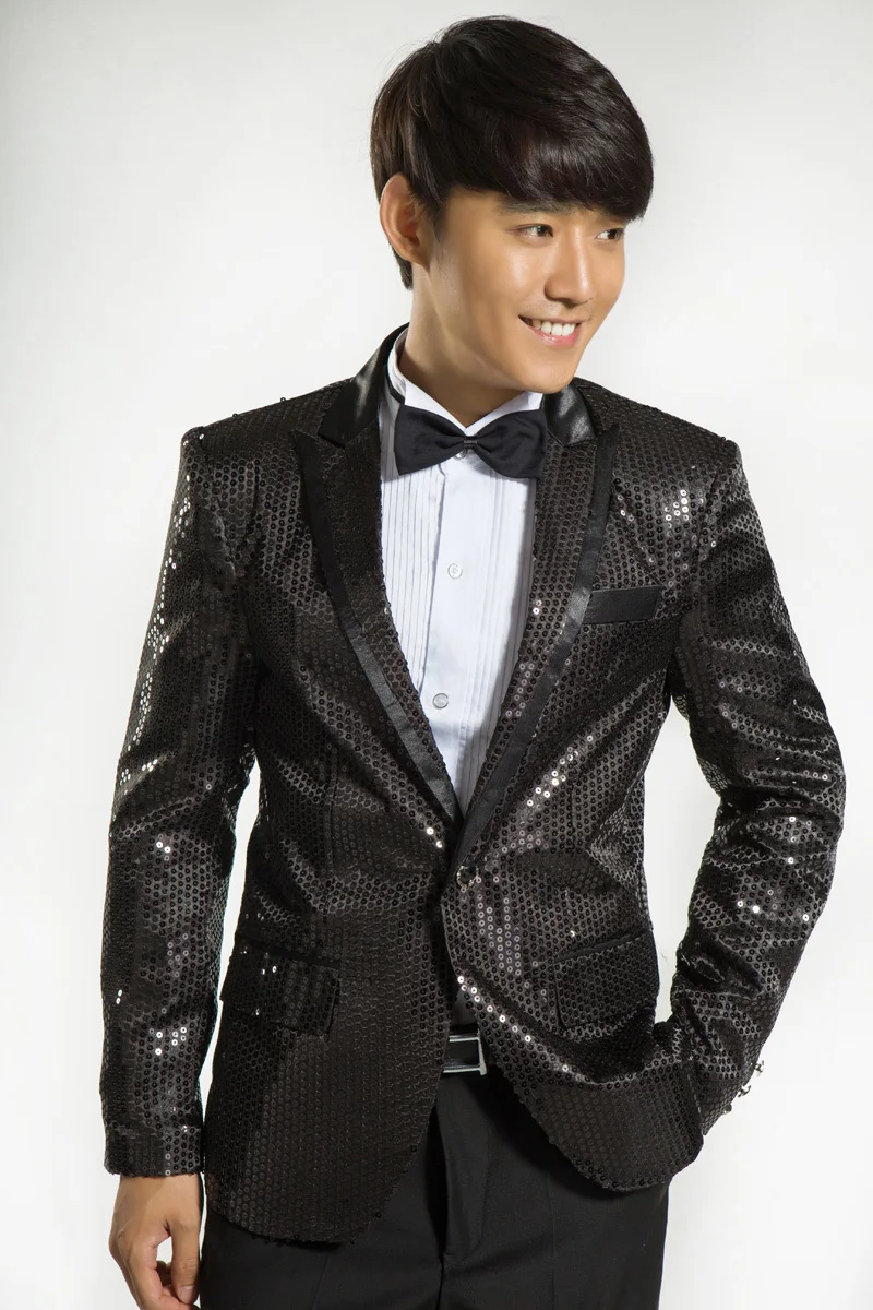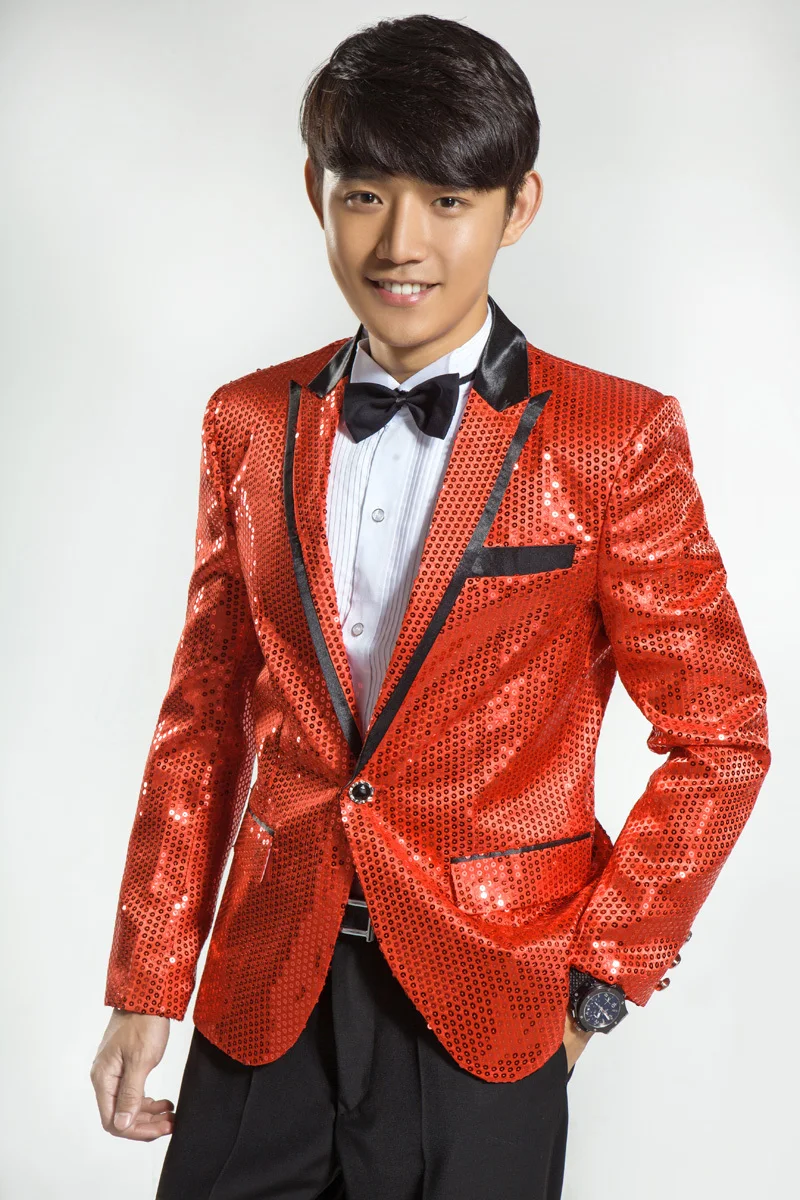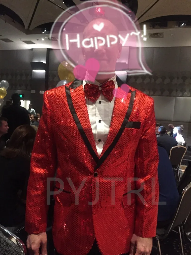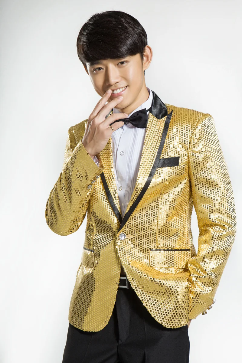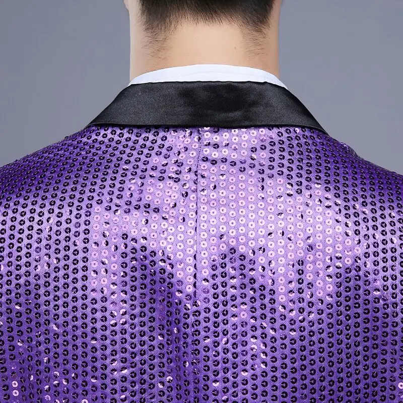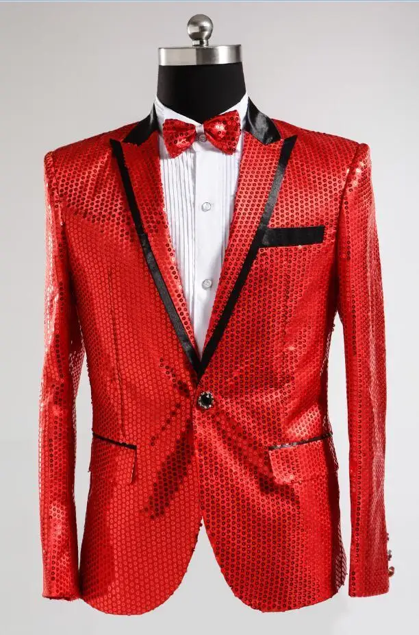 New 7 colors Mens Suit Jacket With Bow Tie Gold White Red Blue Pink Purple Sequin Costume Singer Wedding Grooms Shiny Blazer