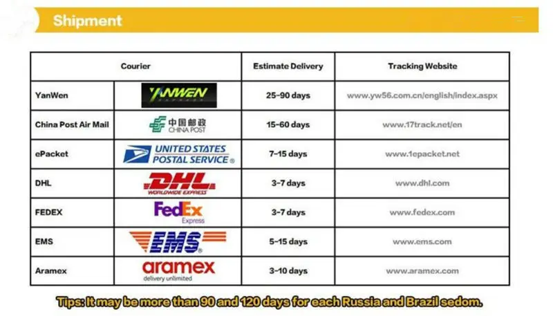 Packages from our warehouse in China will be shipped by ePacket or EMS depending on the weight and size of the product. Packages shipped from our US warehouse are shipped through USPS.
