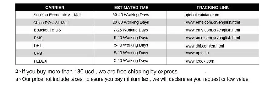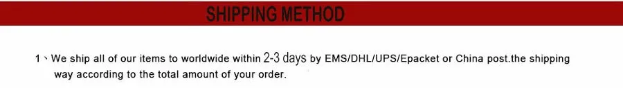 Packages from our warehouse in China will be shipped by ePacket or EMS depending on the weight and size of the product. Packages shipped from our US warehouse are shipped through USPS.