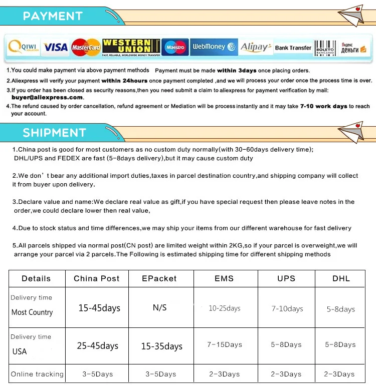 • If you did not receive the product within the guaranteed time( 45 days not including 2-5 day processing) you can request a refund or a reshipment.