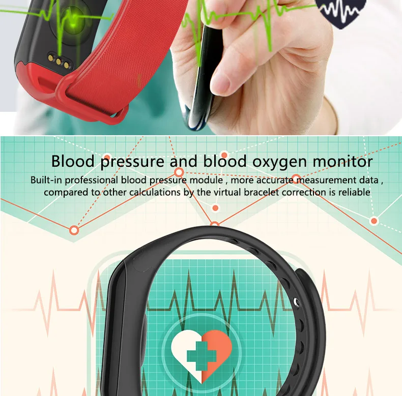 Real time heart rate monitor , blood oxygen monitor, blood pressure monitor, sleep monitoring, sedentary reminder.