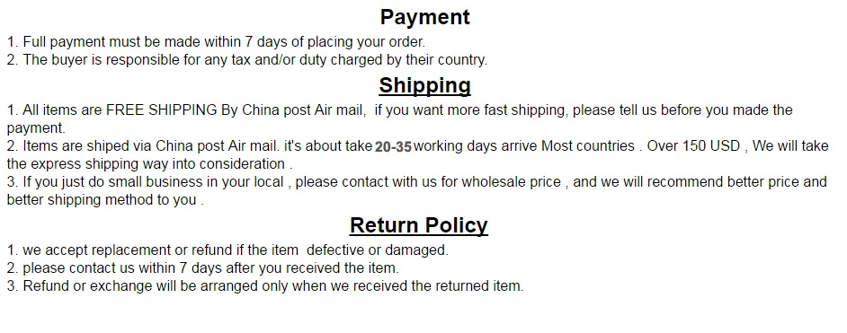 • If you did not receive the product within the guaranteed time( 45 days not including 2-5 day processing) you can request a refund or a reshipment.