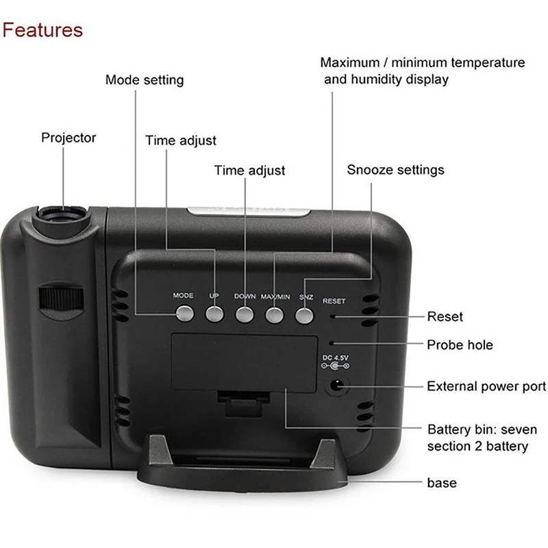 Get all the information you need to get through your day the second you wake up! This clock has a full color screen that displays time, temp, humidity and projects the time onto any wall or ceiling. It also has an alarm function so you never miss a beat. Runs on either 2 AAA battery (not included) or power adapter (not included). Include USB cable and Wall charger.