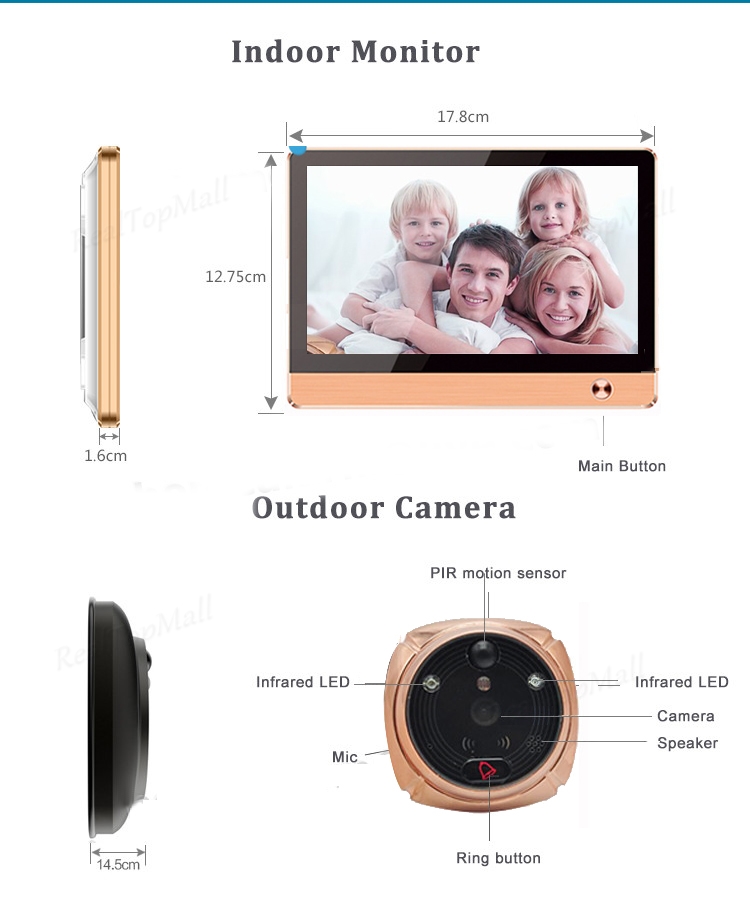 - 1x 7 inch indoor peephole viewer with built-in battery (Golden color as default)