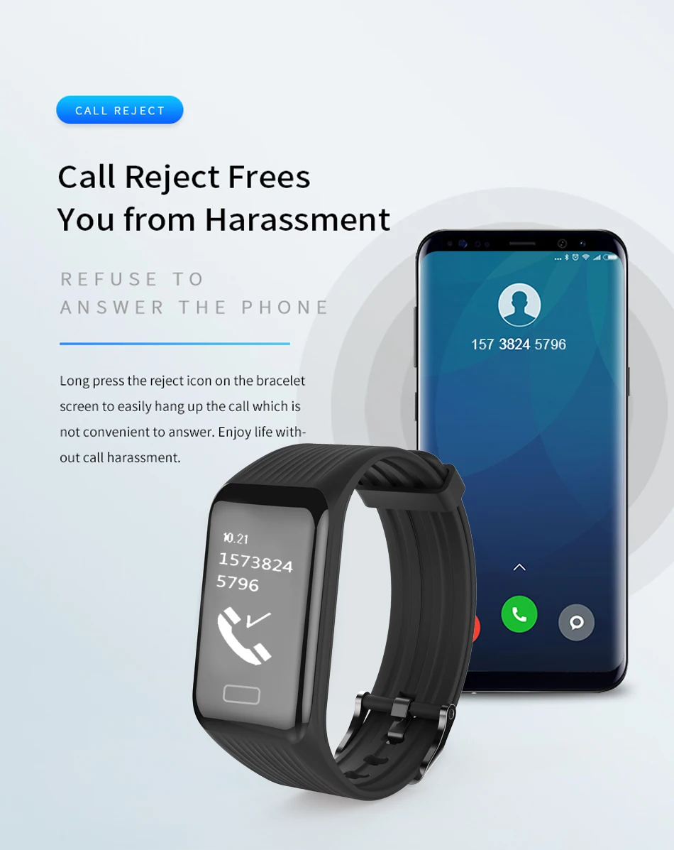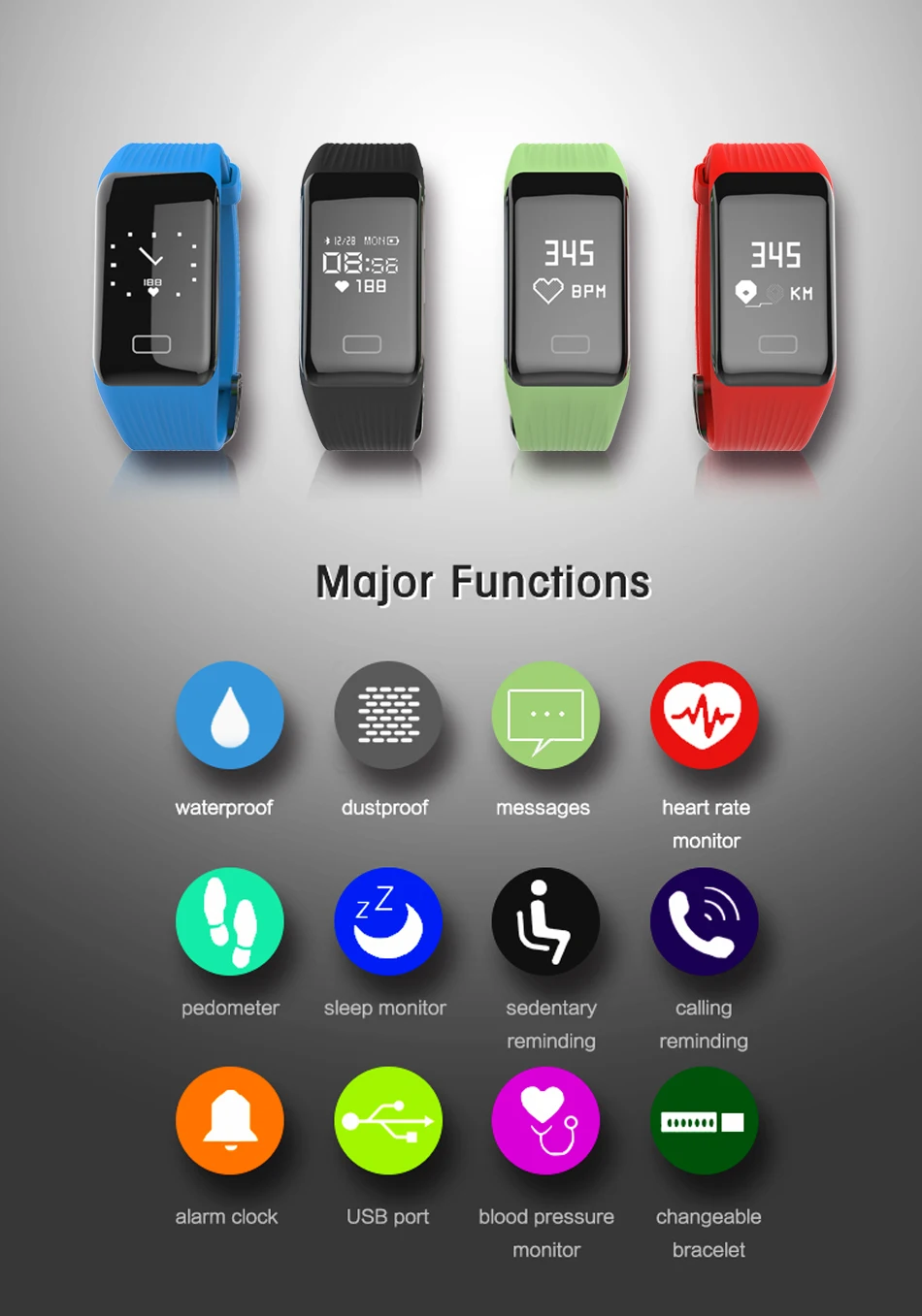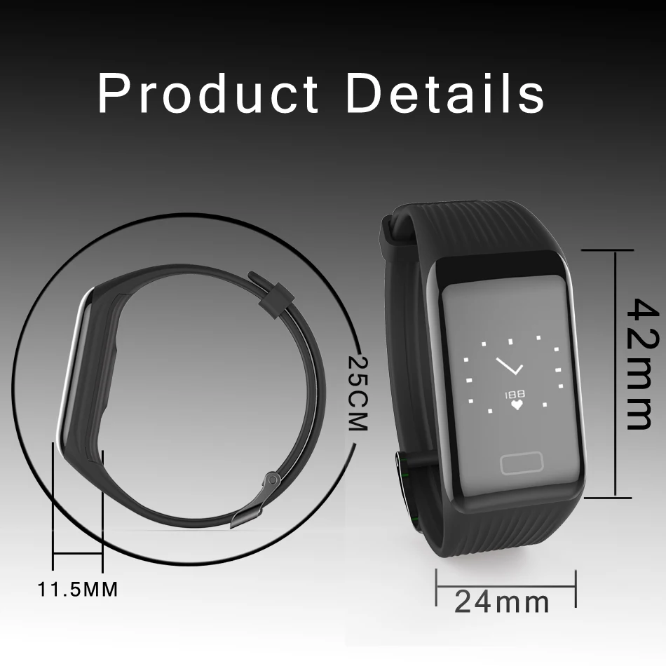 KEY FUNCTION- Pedometer, Calories, Distance, Heart Rate Monitor, Sleep Quality Measurement, Call Reminder, Alarm Clock, Search Bracelet and so on,
