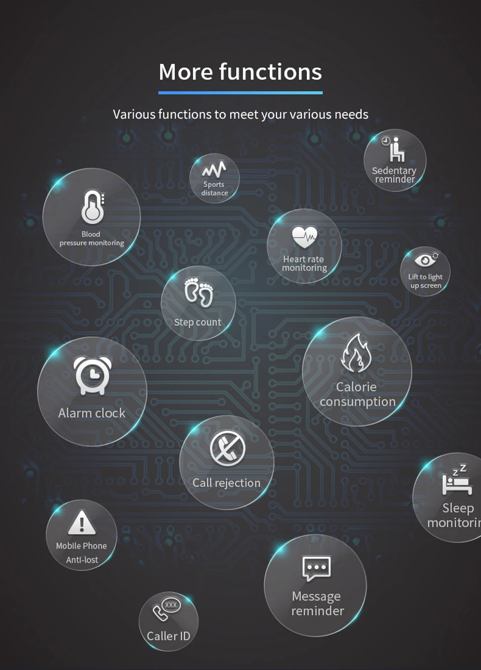 Features: Alarm clock, Camera remote control, Distance recording, Find your phone, Pedometer, Remote control music, Sedentary reminder, Sleep management
