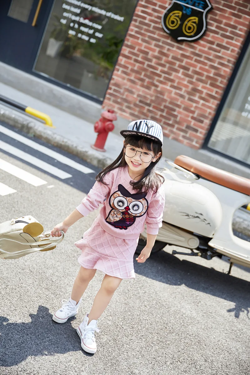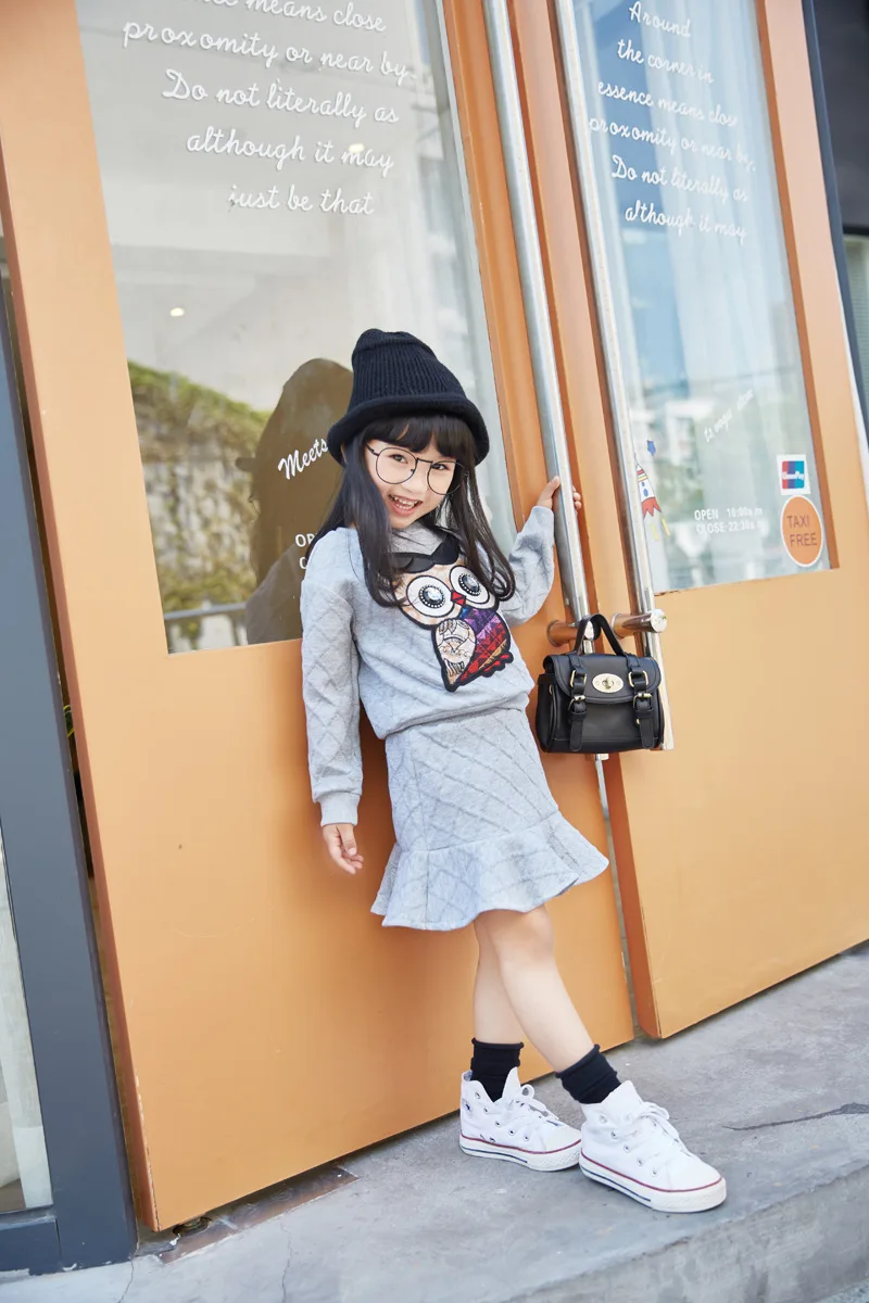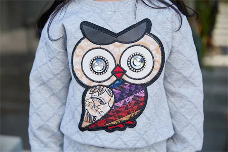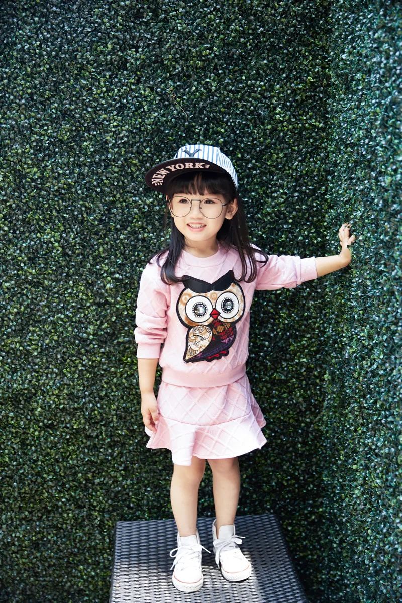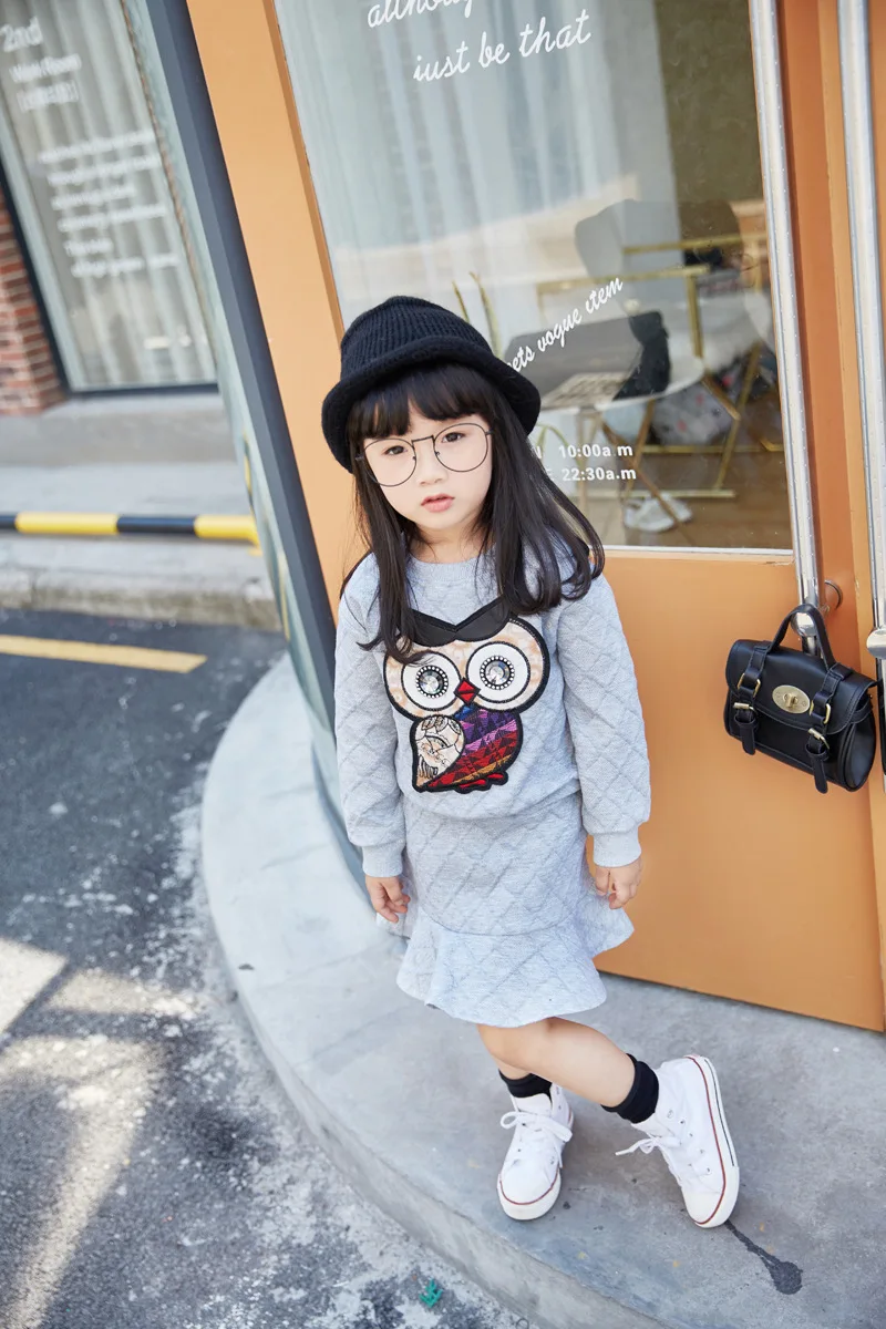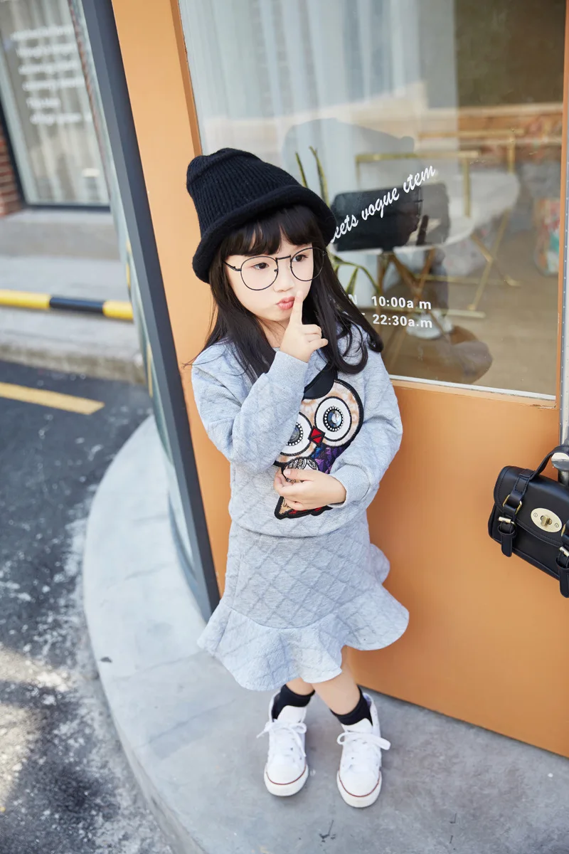 New Girls Clothes Set Long Sleeve Autumn Kids Girl Owl Clothing Suit with Rhinestone Grey Pink Sweatshirt and Fishtail Skirt