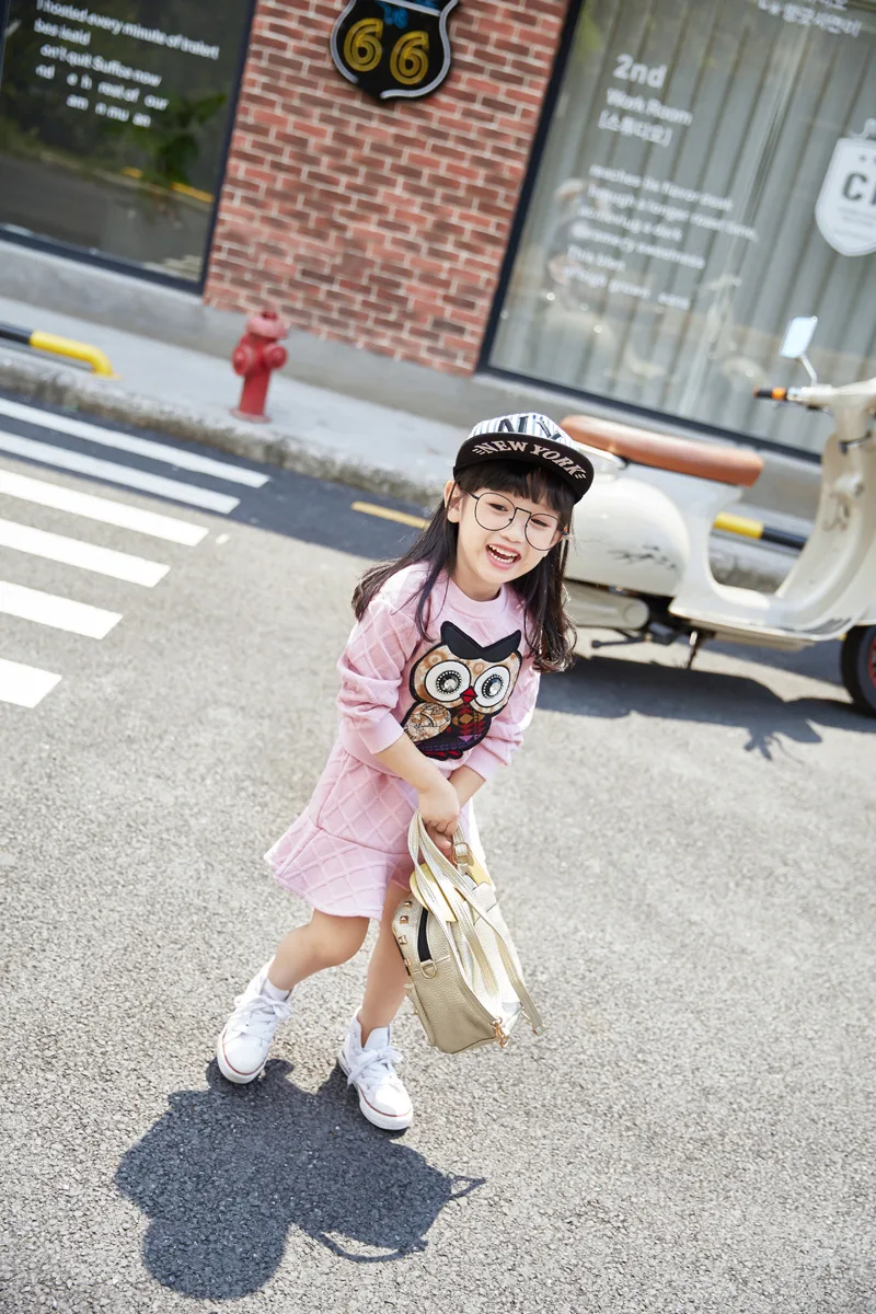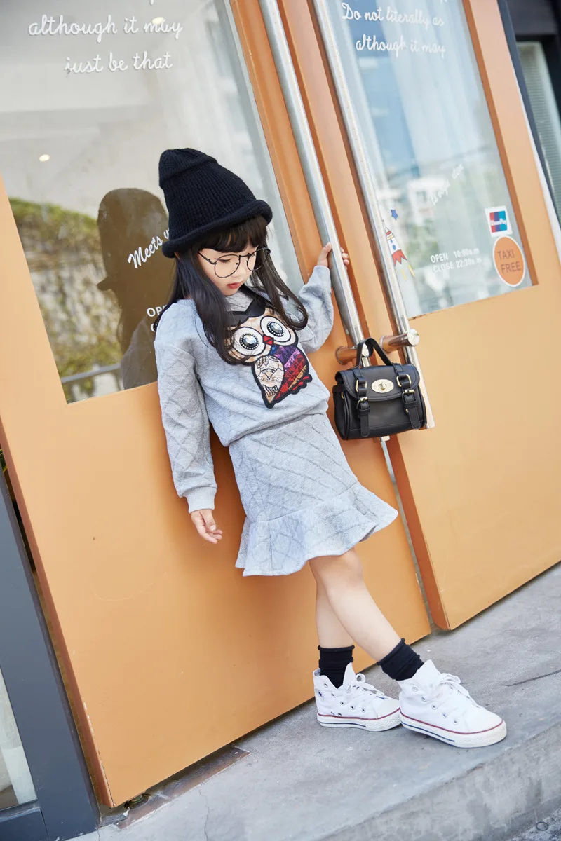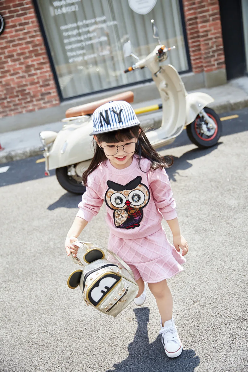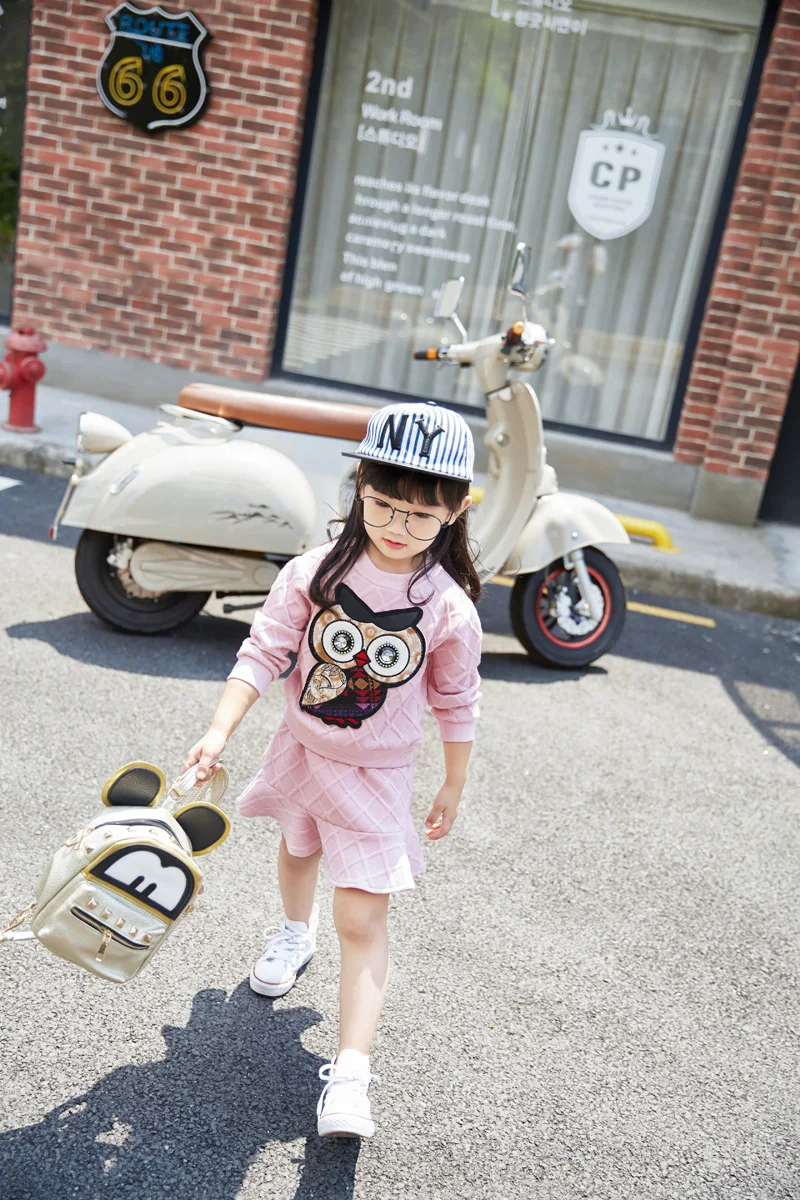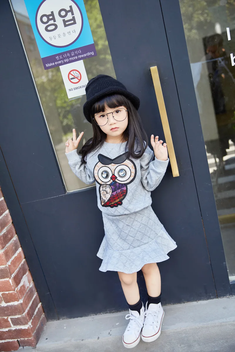 New Girls Clothes Set Long Sleeve Autumn Kids Girl Owl Clothing Suit with Rhinestone Grey Pink Sweatshirt and Fishtail Skirt