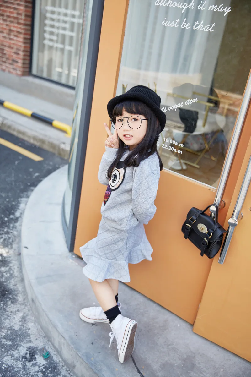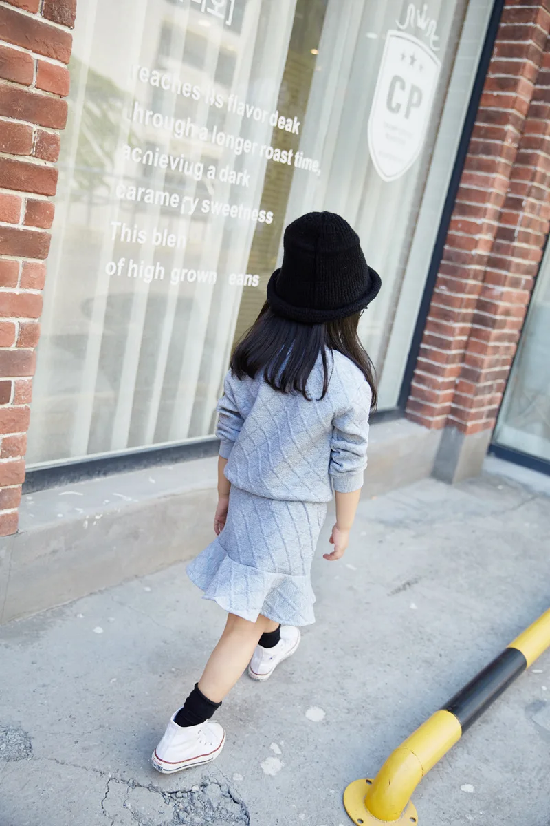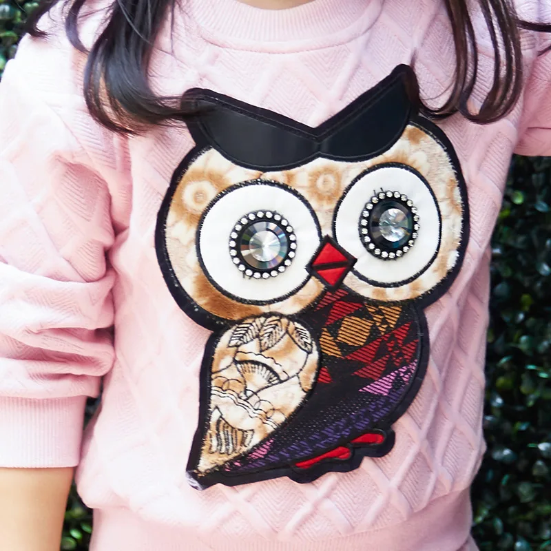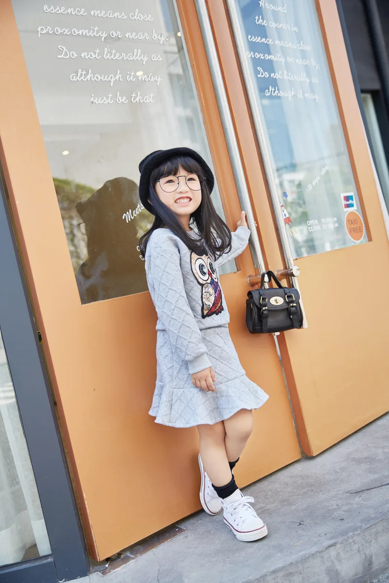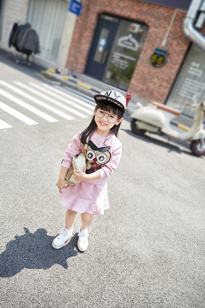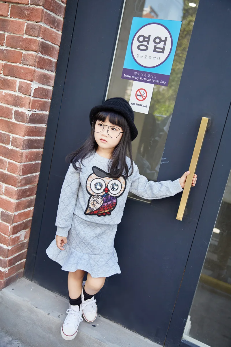 New Girls Clothes Set Long Sleeve Autumn Kids Girl Owl Clothing Suit with Rhinestone Grey Pink Sweatshirt and Fishtail Skirt