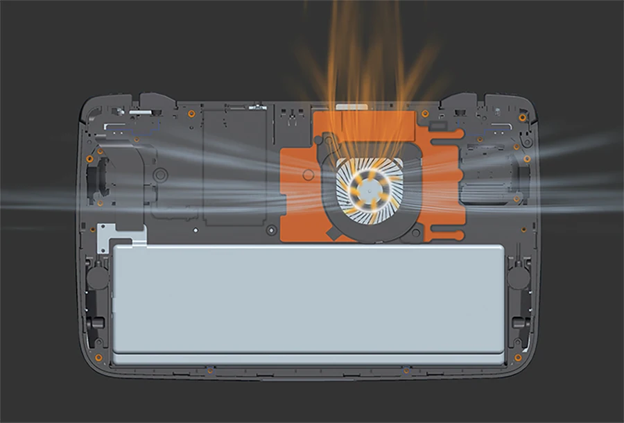The design of the air inlet on the side of previous WIN model makes it easier for them to be blocked by hands when holding the machine, which has been widely criticized. This time around, the air inlet of the WIN 2 has been designed in the bottom surface. The fan then forces hot air out the back of the machine. Hot air only travels a short distance before it exits via the back vent, extracting heat from the machine in nearly no time. In limited tests, the temperature of the machine can be controlled at about 39 degrees.