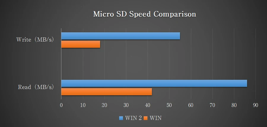 The price advantage of Micro SD is quite obvious compared to SSD, and the read/write speed is not lower than that of eMMC. The Micro SD is therefore a powerful complement to the WIN 2 storage options.