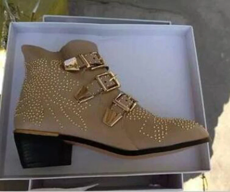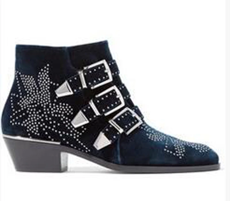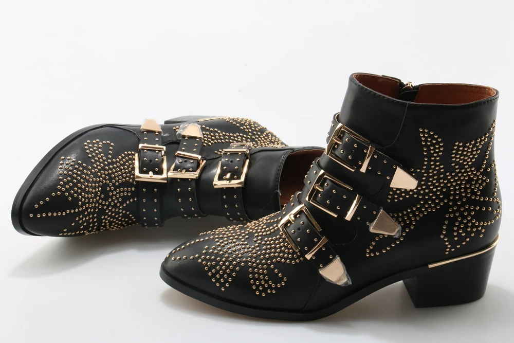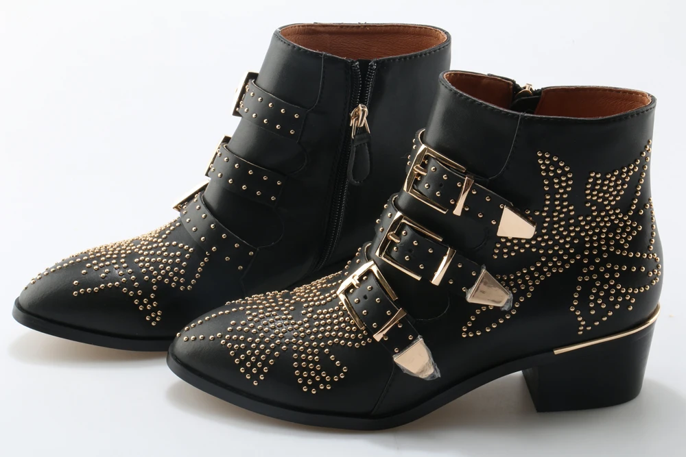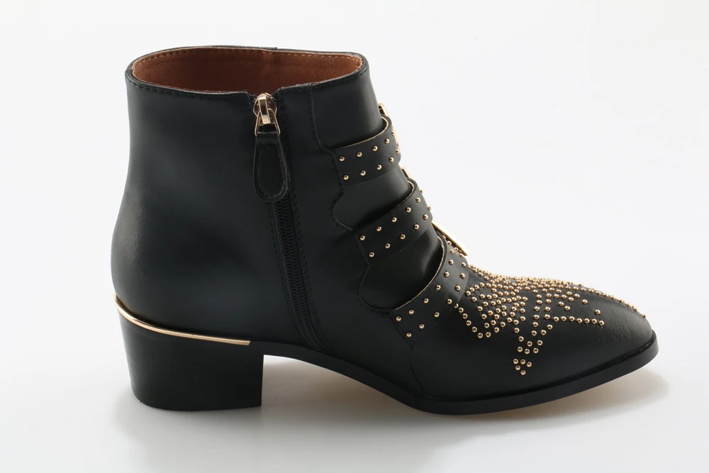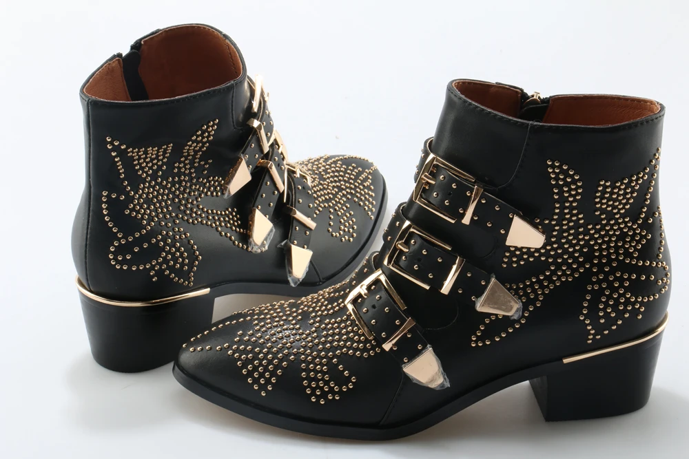 Name : New Leather Rivets Booties Buckle Straps Thick Heel Ankle Boots Studded Decorated Motorcycle Boots Woman Riding Boots