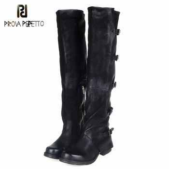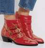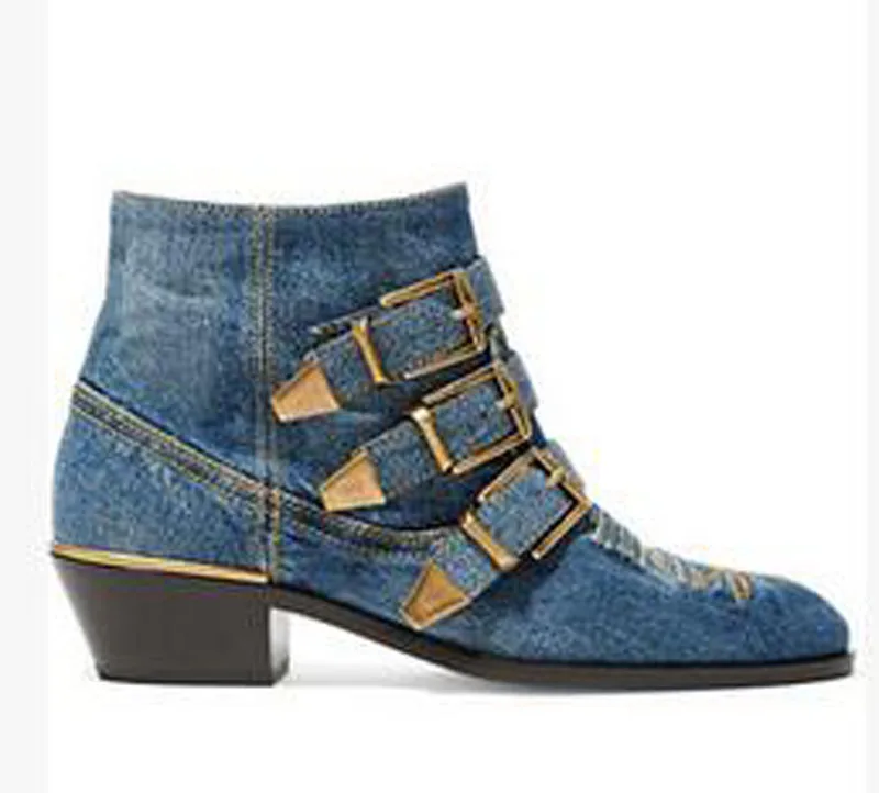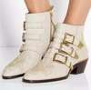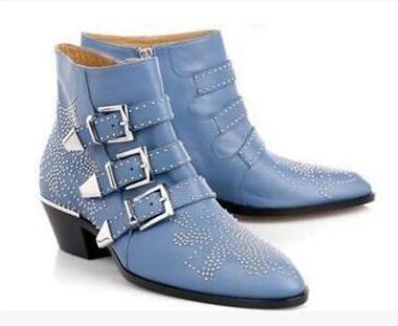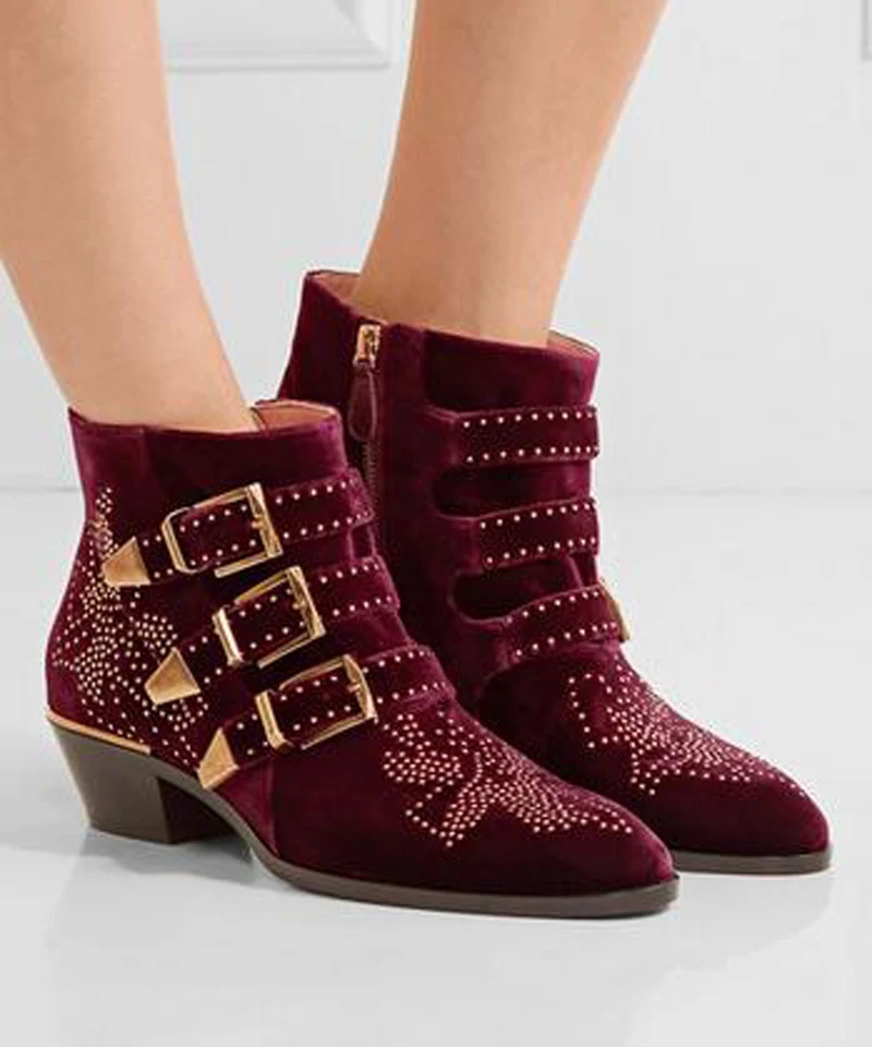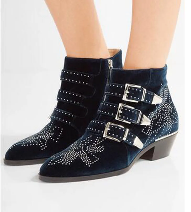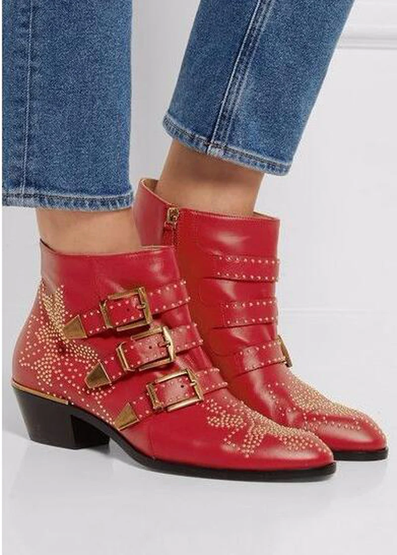 Name : New Leather Rivets Booties Buckle Straps Thick Heel Ankle Boots Studded Decorated Motorcycle Boots Woman Riding Boots