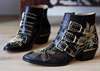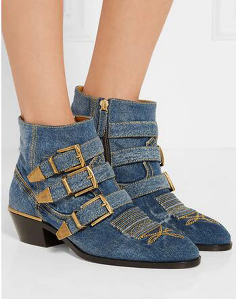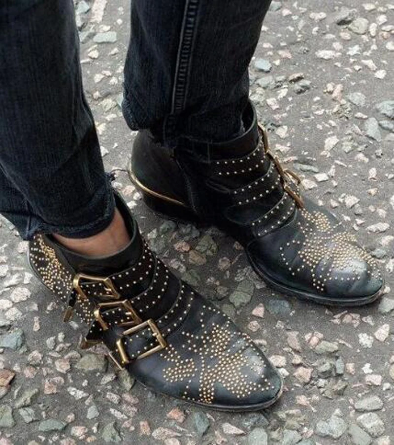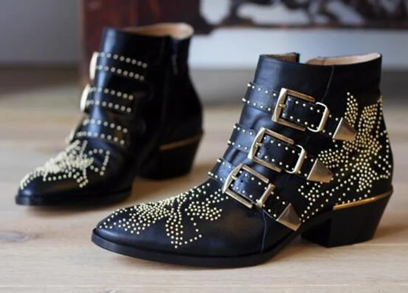 New Leather Rivets Booties Buckle Straps Thick Heel Ankle Boots Studded Decorated Motorcycle Boots Woman Riding Boots