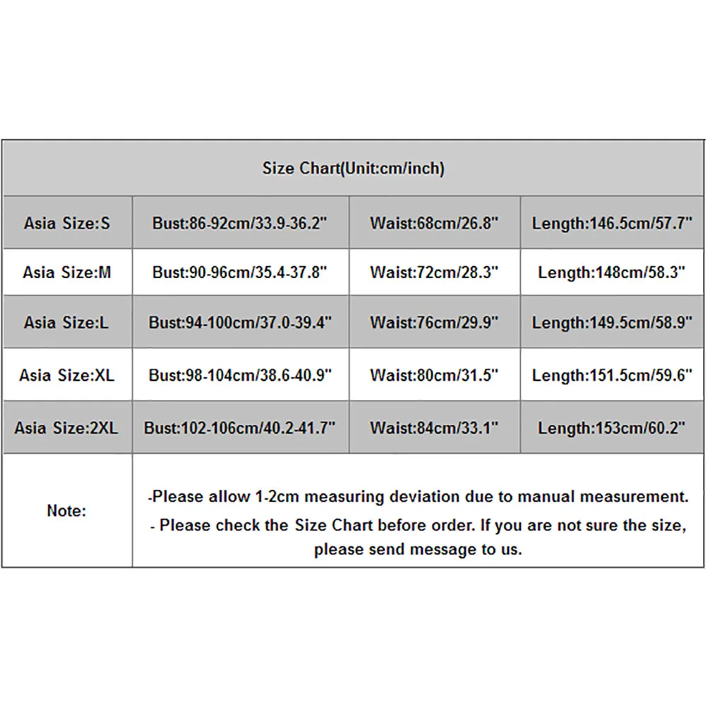 Asia Size:S Bust:86-92cm/33.9-36.2″ Waist:68cm/26.8″ Length:146.5cm/57.7″