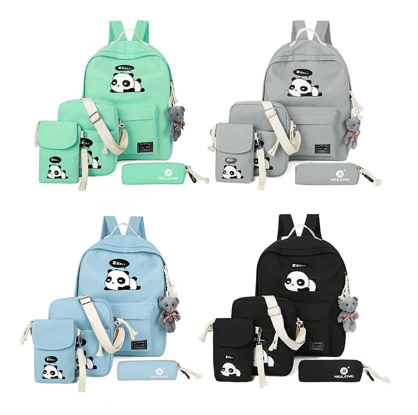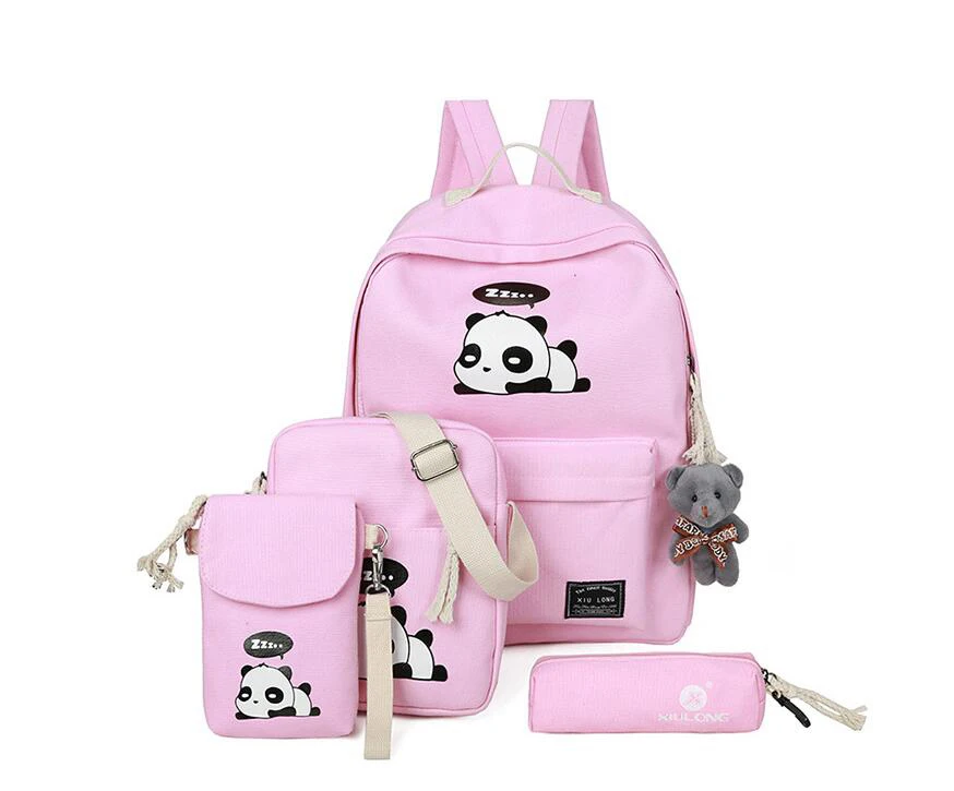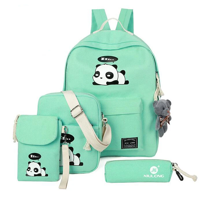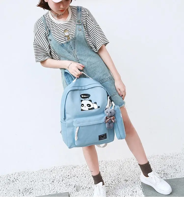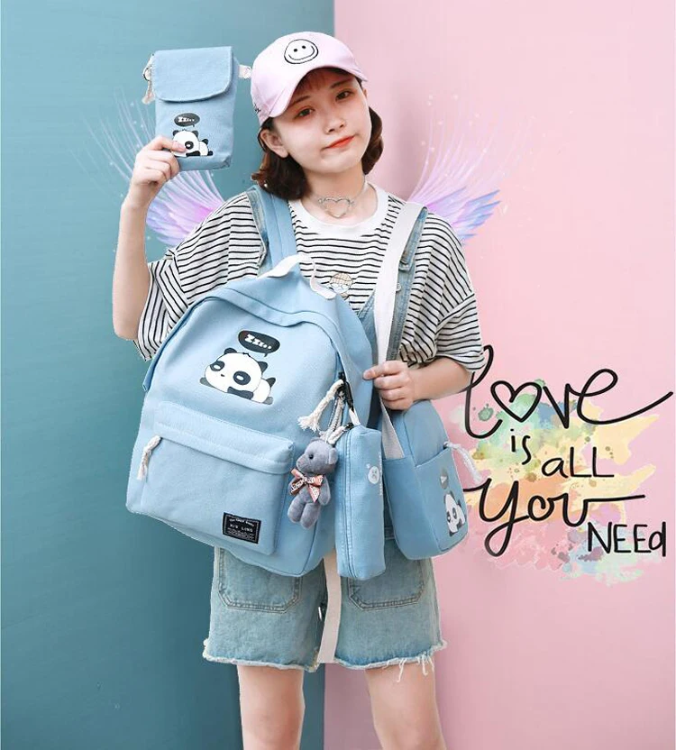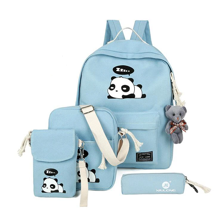 New Panda School Blue Bags For Teenage Girls Canvas Backpack Girls 4pcs/set Knapsacks For Teens Pencil Holder Student Bookbag