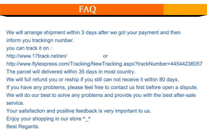 • If you did not receive the product within the guaranteed time( 45 days not including 2-5 day processing) you can request a refund or a reshipment.