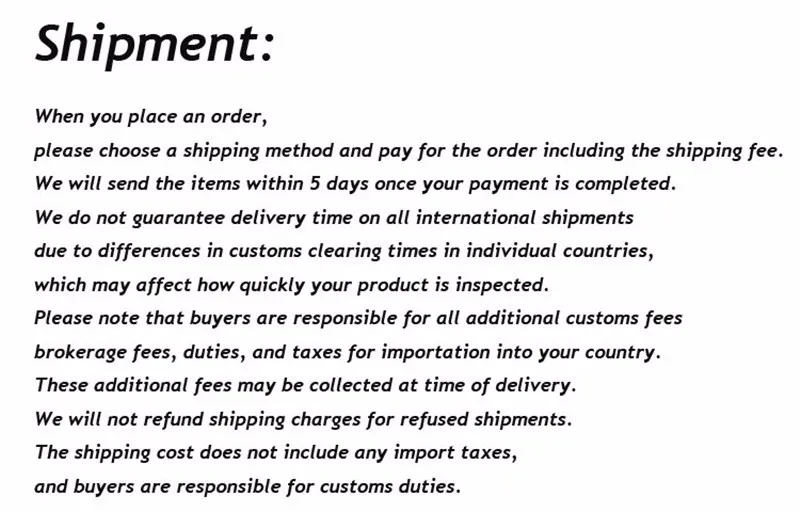 We are not responsible for any custom fees once the items have shipped. By purchasing our products, you consent that one or more packages may be shipped to you and may get custom fees when they arrive in your country.