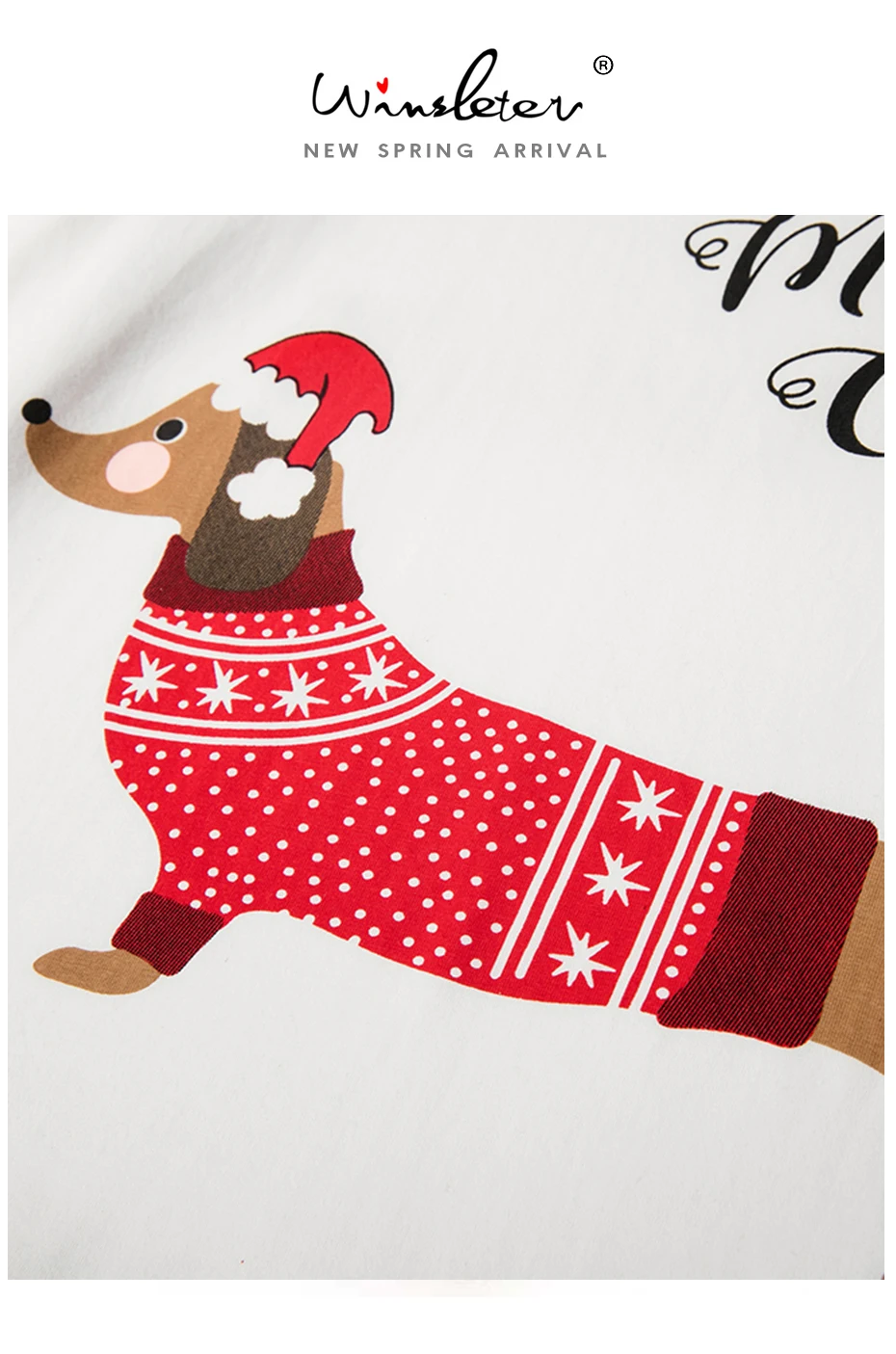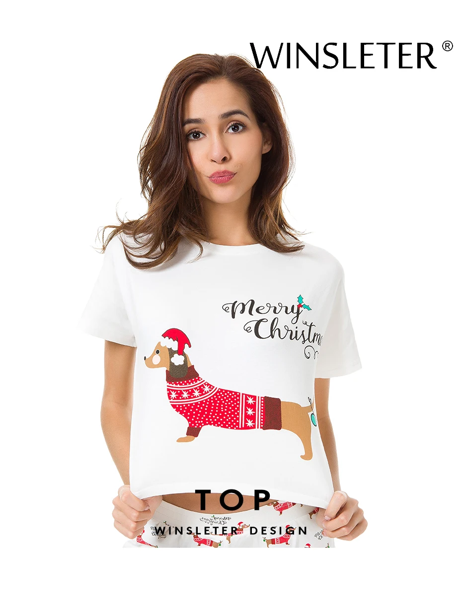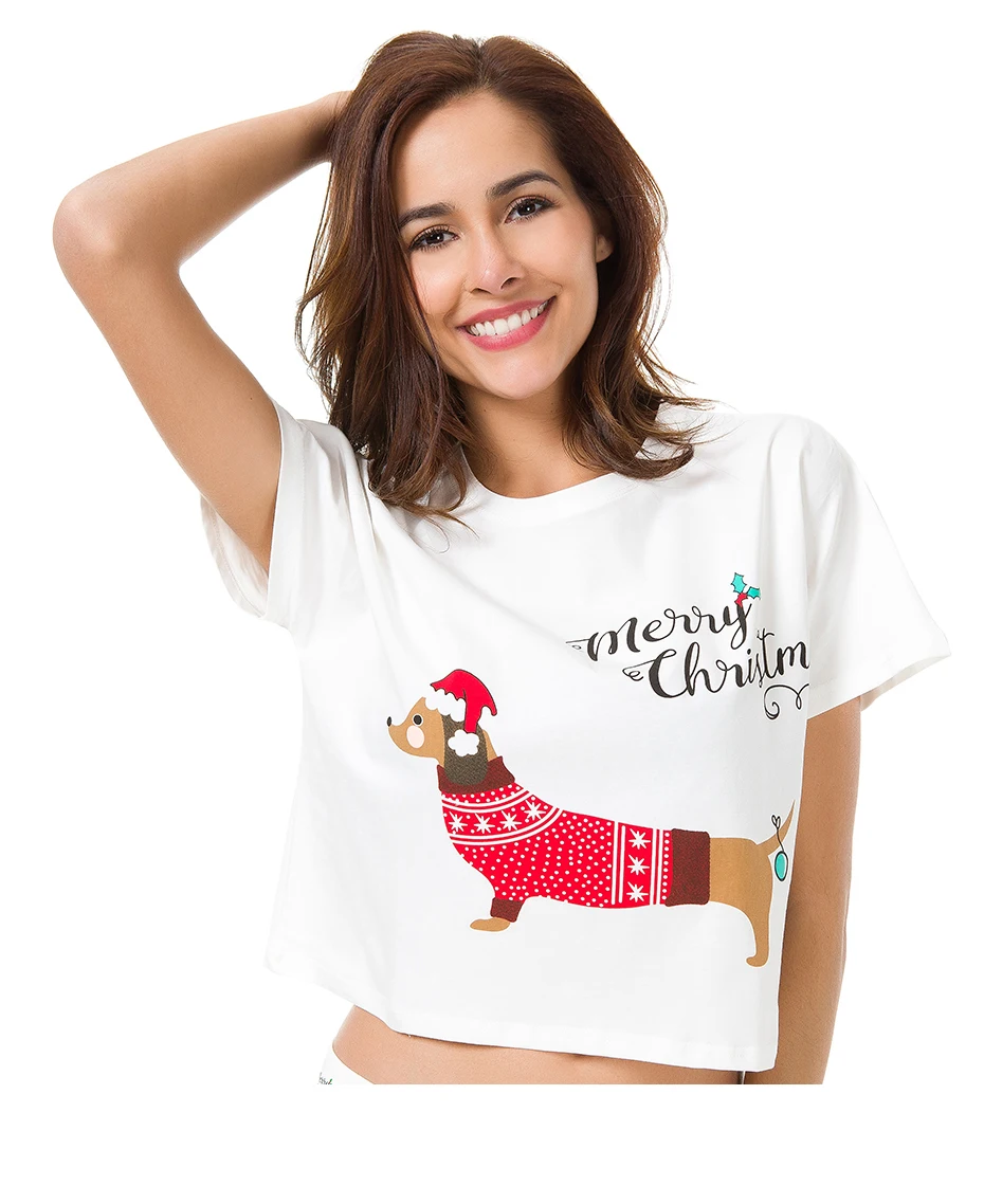 New Sleep Top Christmas Dachshund With Santa Hat Dog Print Loose T shirt Women Crop Top Short Top Cotton Pajamas pyjamas T7N001