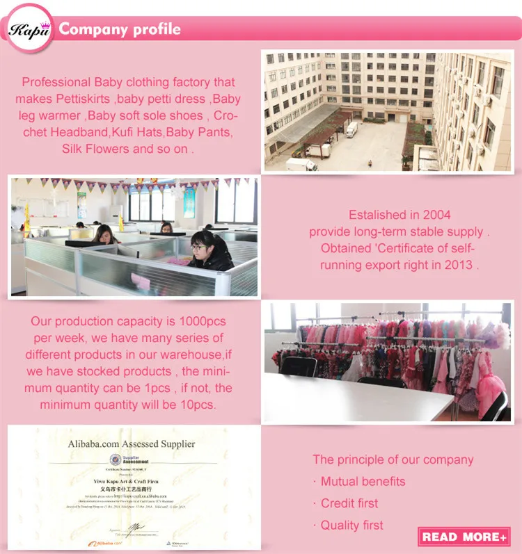 ♣ Why choose KAPU”vertical-align:baseline;text-align:center;”>Professional Baby clothing factory that makesPettiskirts ,baby petti dress ,Baby leg warmer ,Baby soft sole shoes ,Crochet Headband,Kufi Hats,Baby Pants,Silk Flowersand so on.