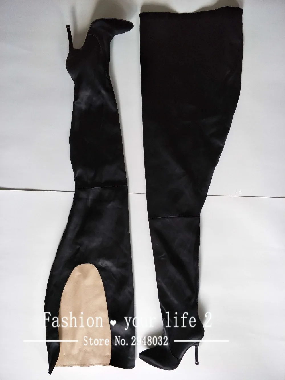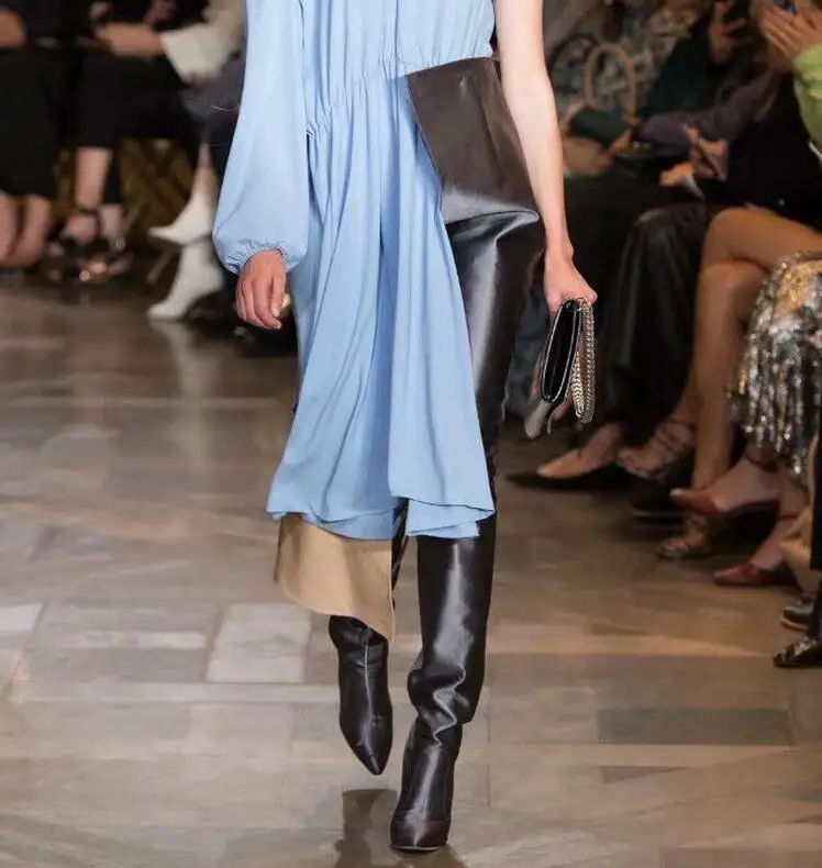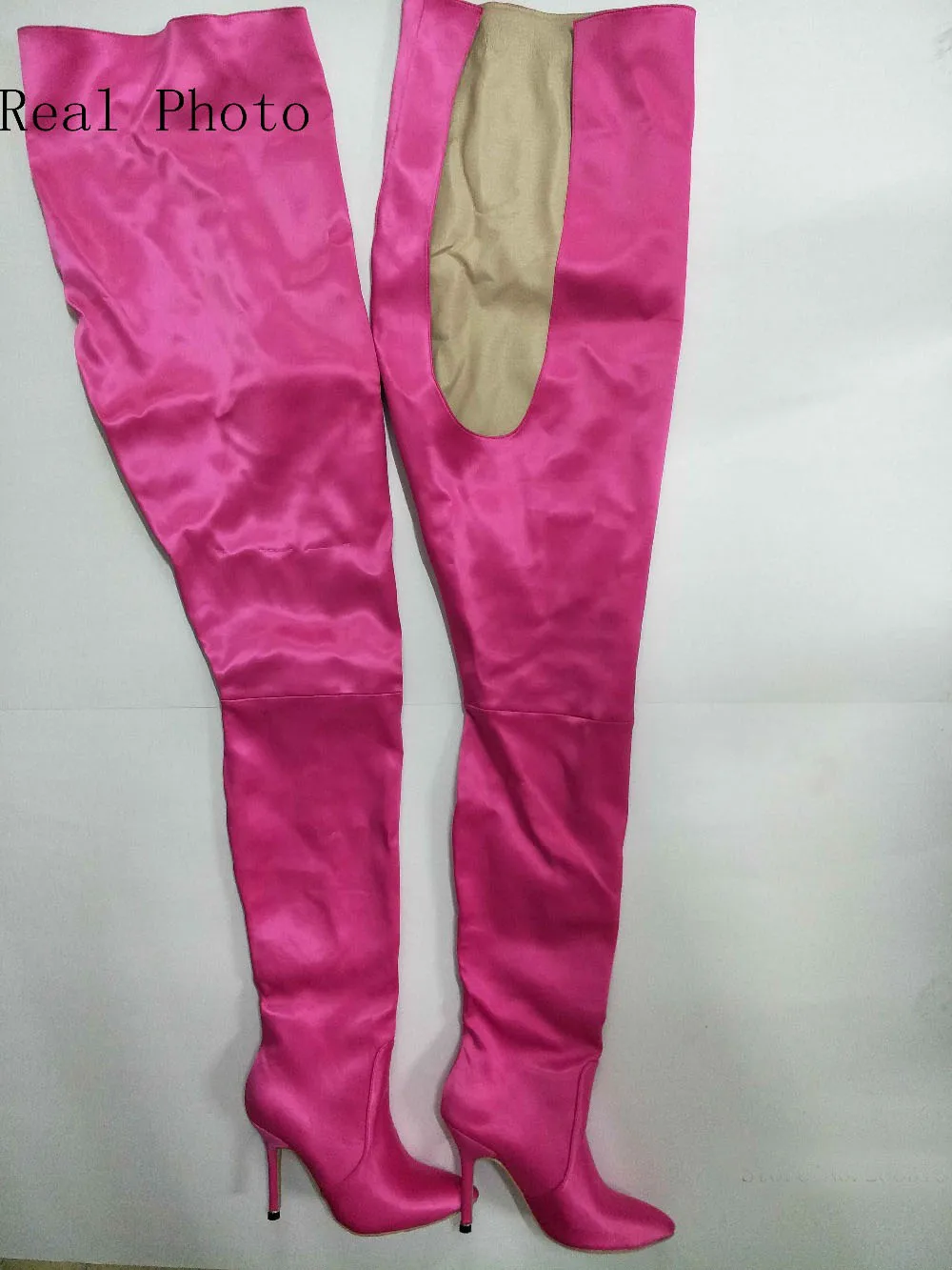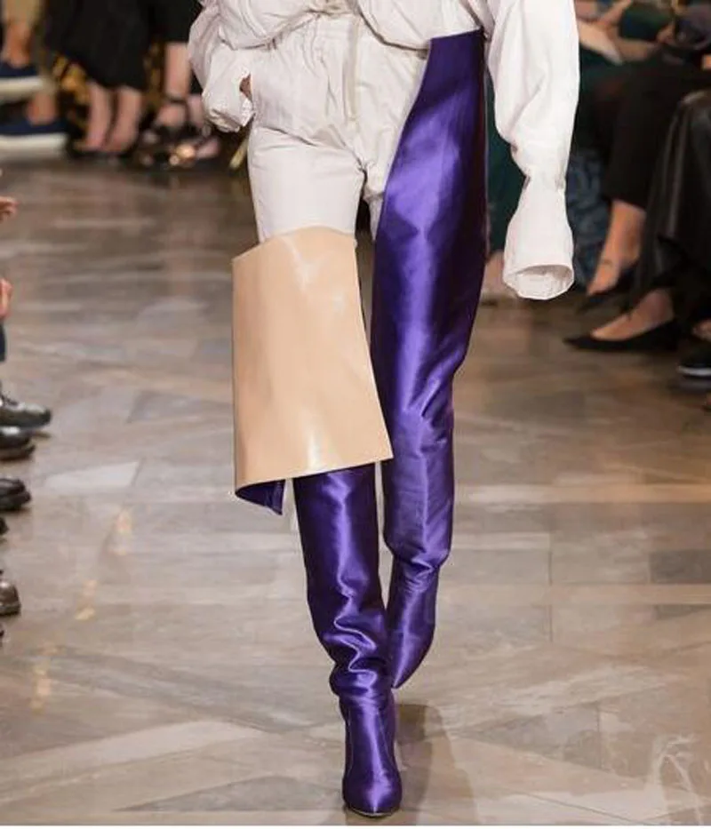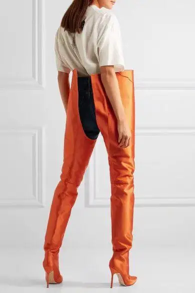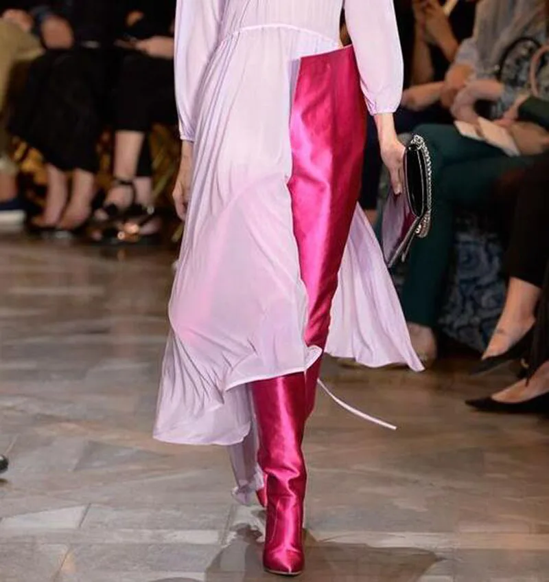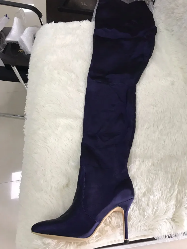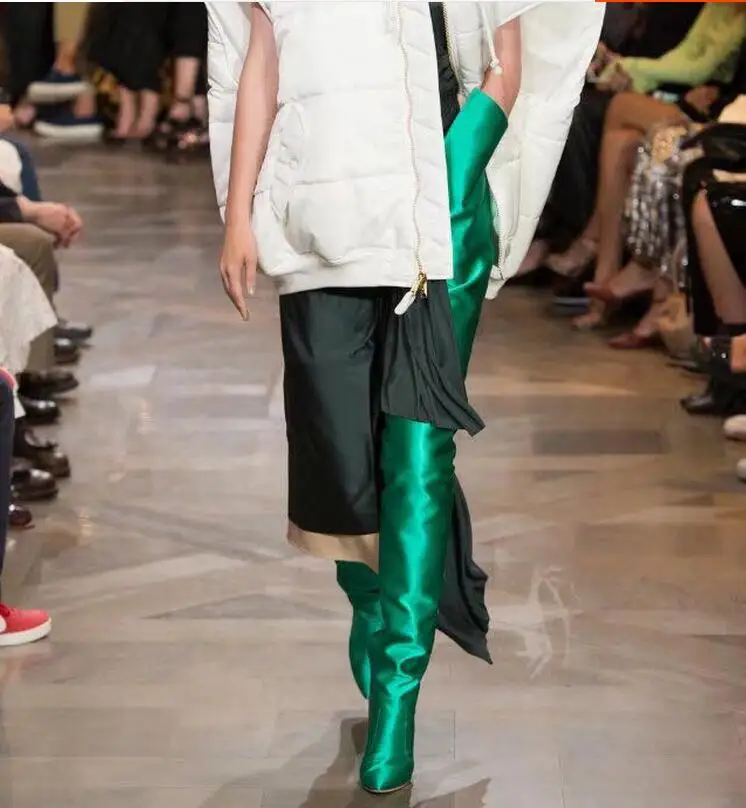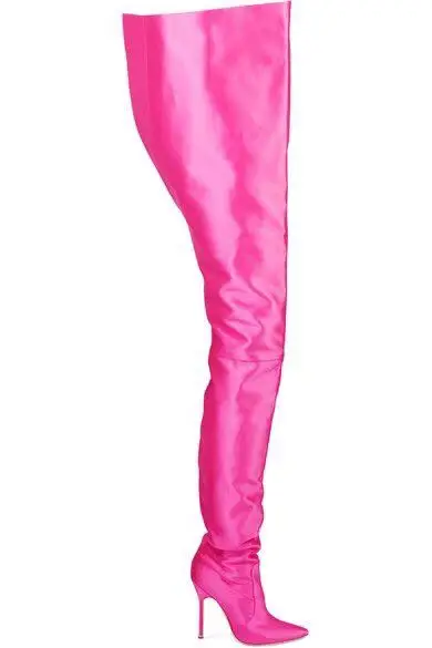 NEW Woman Extreme Long Waist High Boots Fluorescence Color Stretch Satin Thin High Heels Pointed toe Stage Long Booties Shoes