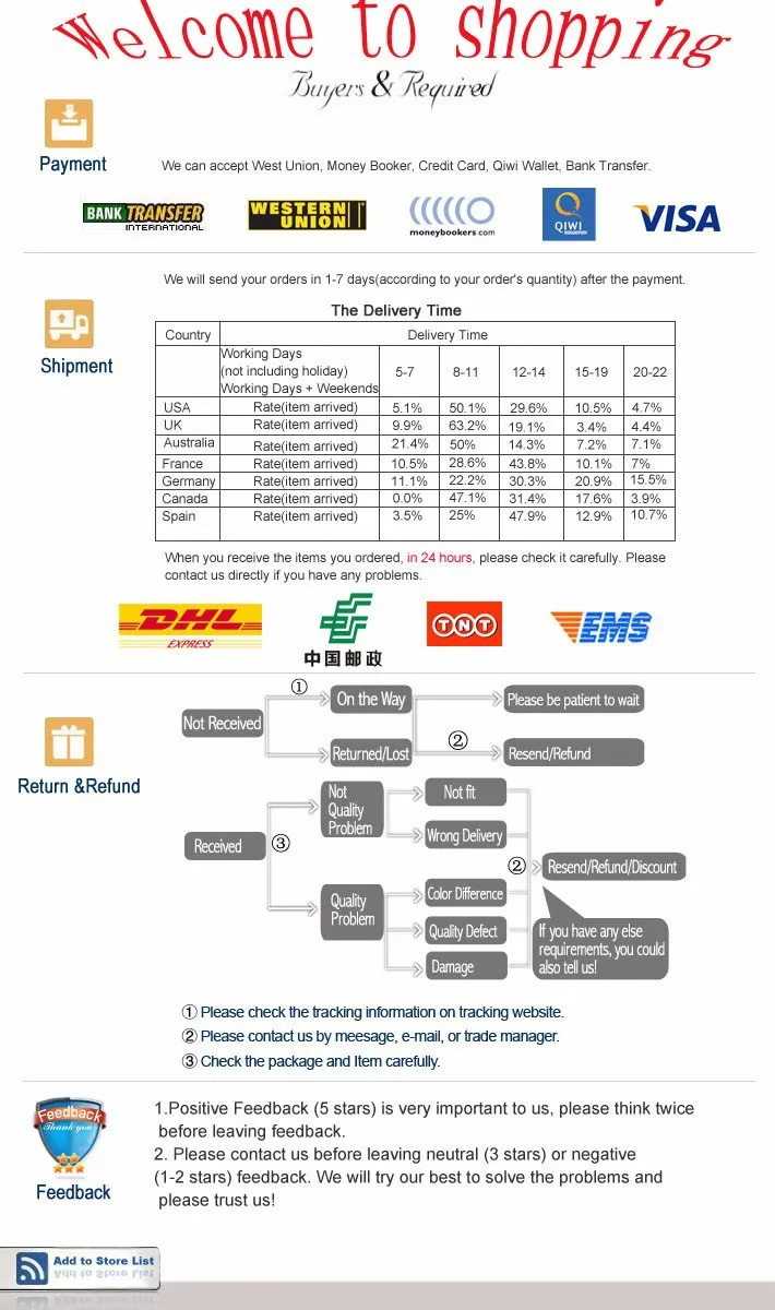 • If you did not receive the product within the guaranteed time( 45 days not including 2-5 day processing) you can request a refund or a reshipment.