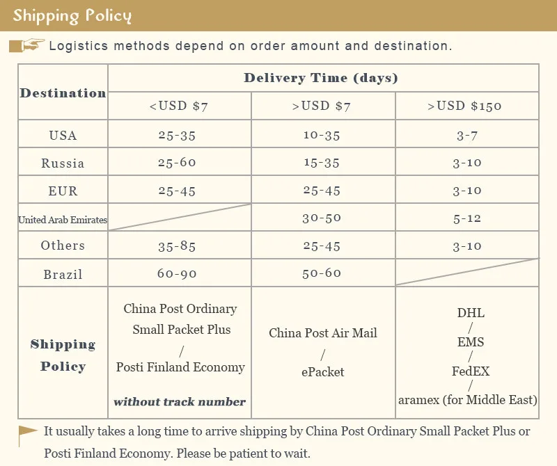 Packages from our warehouse in China will be shipped by ePacket or EMS depending on the weight and size of the product. Packages shipped from our US warehouse are shipped through USPS.