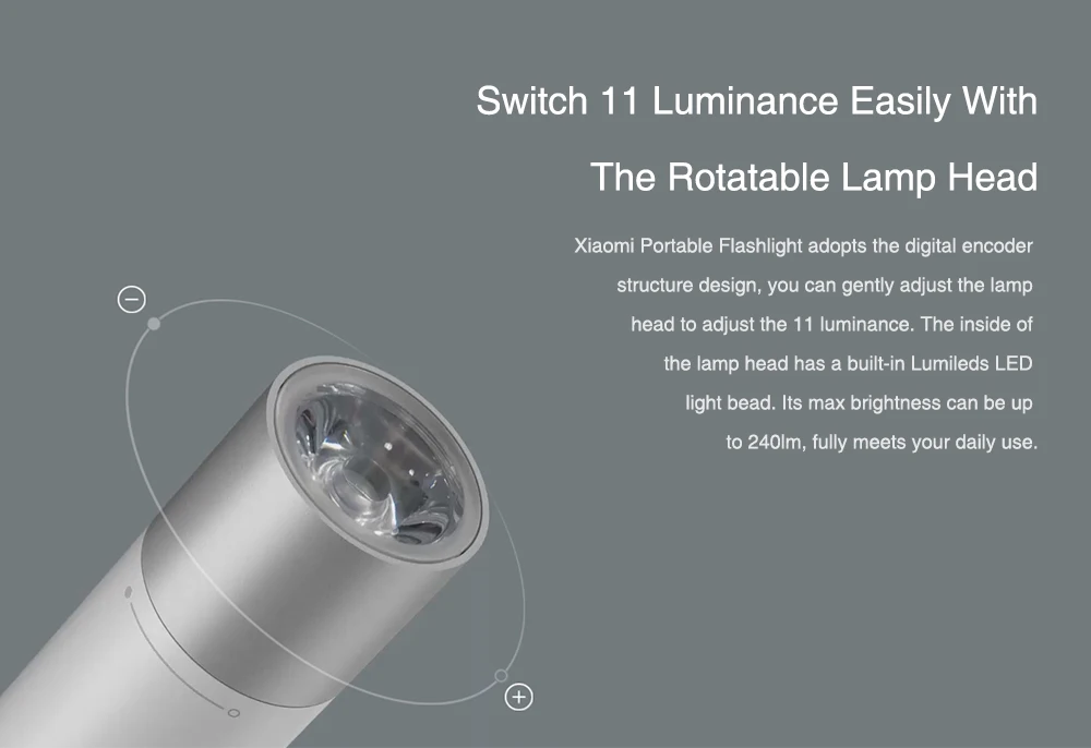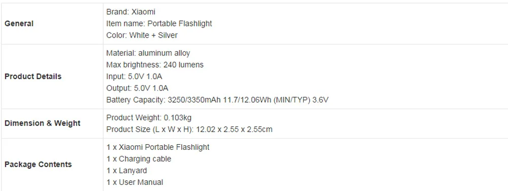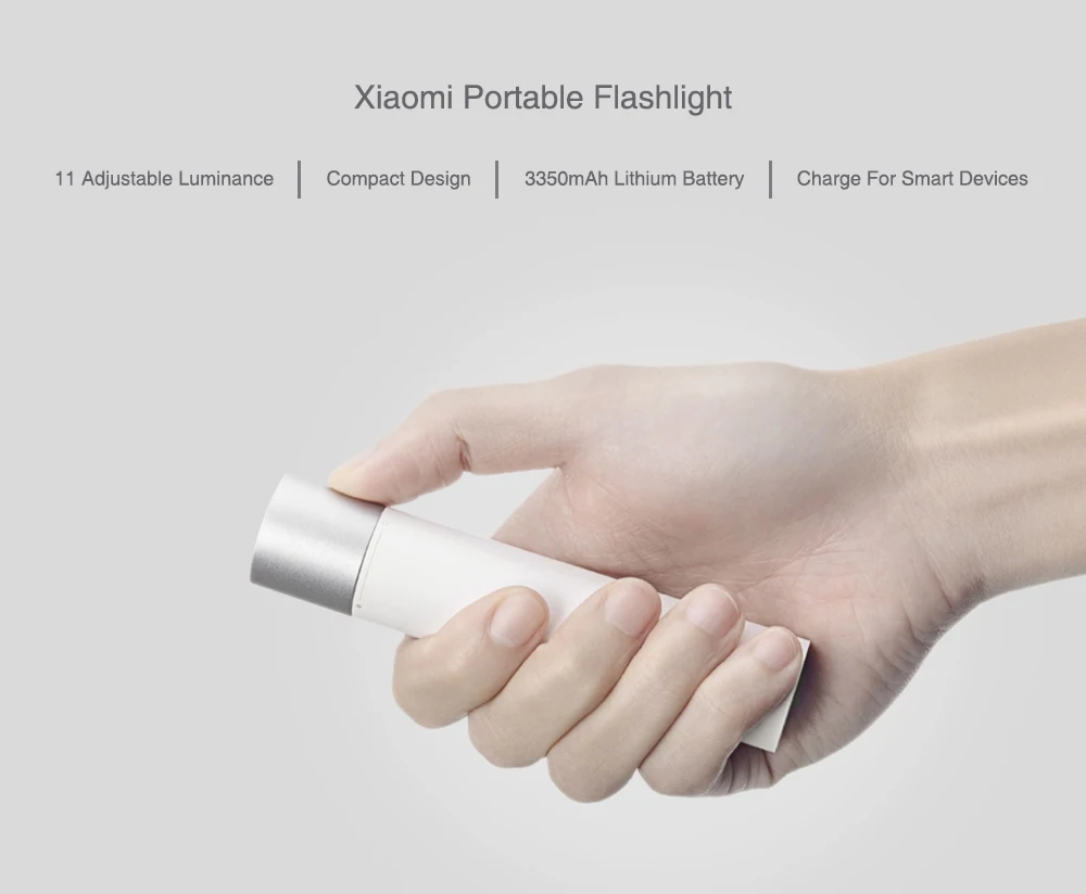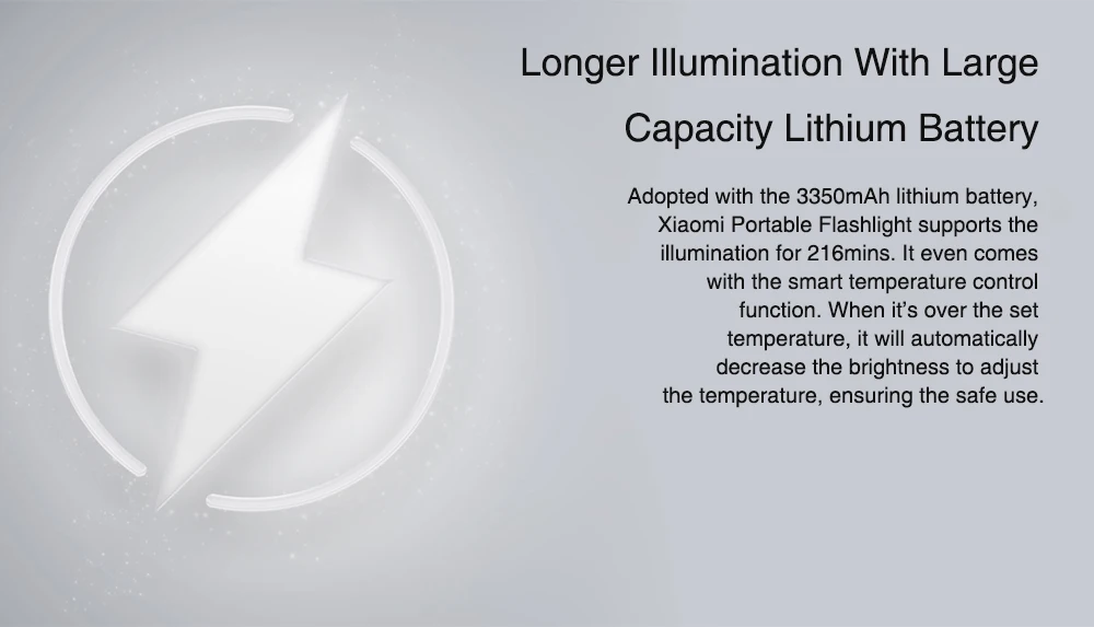 Xiaomi Portable Flashlight comes with a 3350mAh large capacity battery, bringing you a brightness endurance for 216mins.