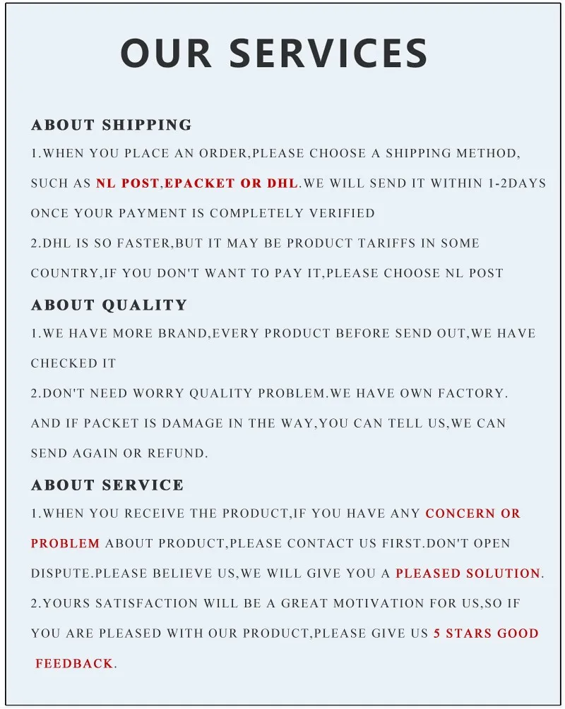 • If you did not receive the product within the guaranteed time( 45 days not including 2-5 day processing) you can request a refund or a reshipment.