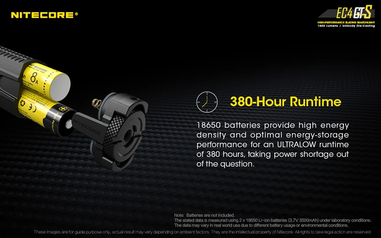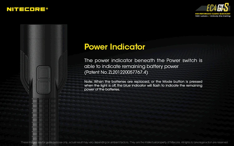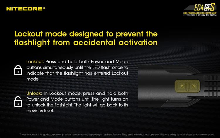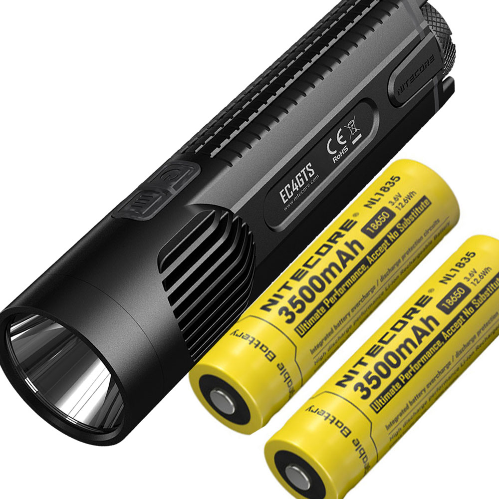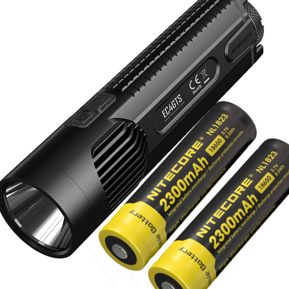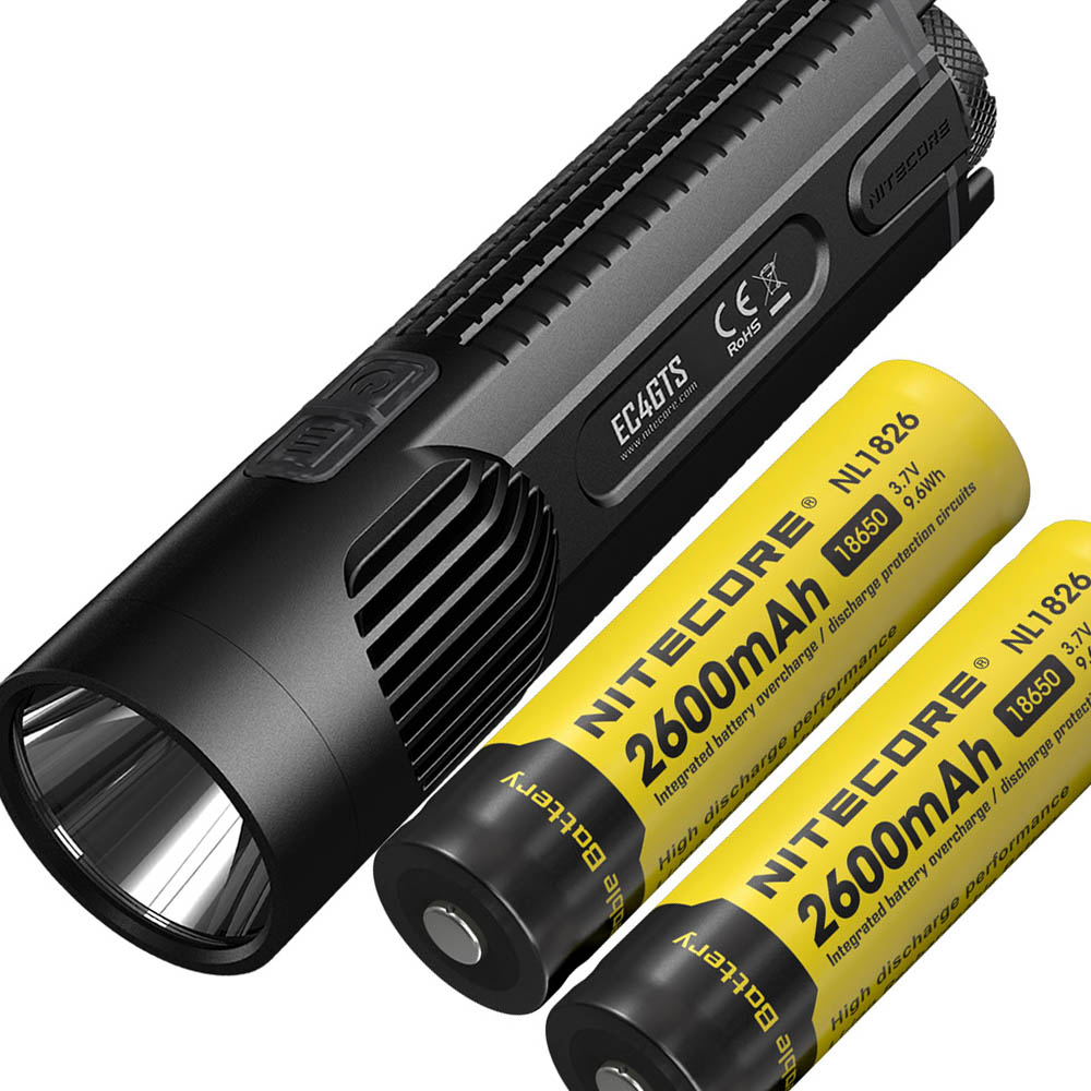 The Nitecore EC4GTS searchlight is still powered by two 18650 Li-ion rechargeable batteries (sold separately), however, please note that a major difference between this newly released light and its predecessor is that the EC4GTS is no longer compatible with CR123A cells. For best results, we recommend powering your searchlight with two 3500mAh protected, button top 18650 batteries. What has stayed the same is that the Nitecore EC4GTS still features a built-in power indicator within the dual button side switch. A blue indicator light will flashlight to notify a user of the light’s remaining battery power; three flashes indicates that power is above 50%, two is equal to less than 50% and one quick flash implies that the light’s battery will require charging soon. In-between uses, feel free to put your searchlight into Lockout mode to prevent accidental activation while it is stored in your pack. The Nitecore EC4GTS searchlight features all of the same great features of its predecessor, the EC4GT, except that it is now brighter than ever. Upgrade your hand-held searchlight’s performance by incorporating this new-and-improved flashlight into your arsenal.