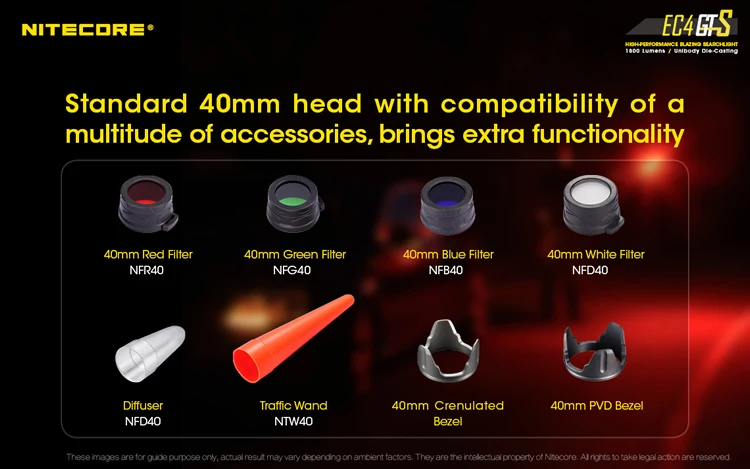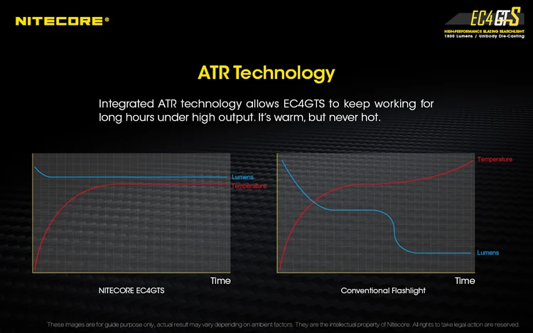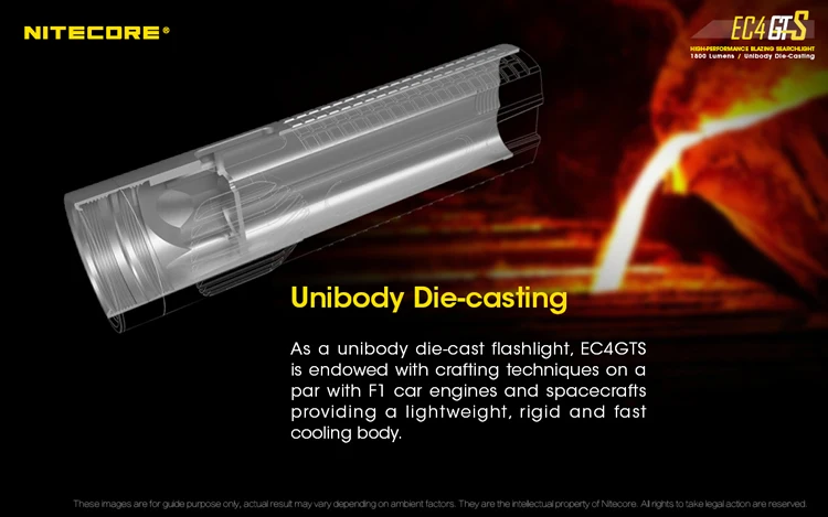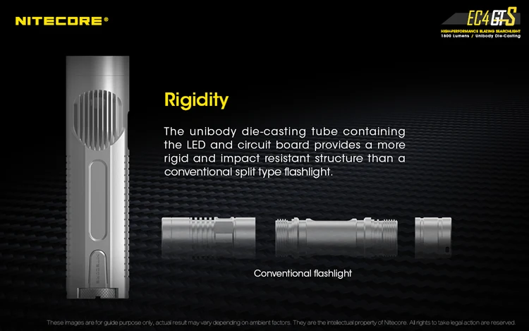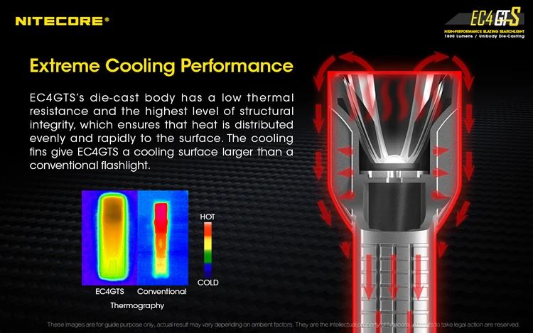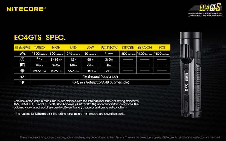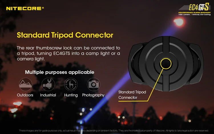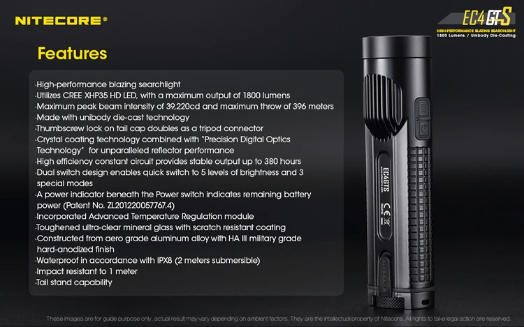 Often times a manufacturer must sacrifice performance elsewhere in order to improve upon a light’s feature set – this is not the case with the new EC4GTS. This hand-held searchlight still offers five unique output modes, ranging in brightness from 1800 down to the handy 1-Lumen moonlight mode, which still runs for up to 380 hours. Also still provided by the light are the three specialty modes: Strobe, SOS, and Location Beacon. Finally, the Nitecore EC4GTS still features an impressive beam throw (396 meters, or 433 yards) that is perfect for use by search-and-rescue teams. This hand-held LED flashlight is even capable of hands-free illumination by simply connecting the rear thumbscrew lock to a tripod. This is extremely helpful for use while hunting, taking photographs, or while even camping.