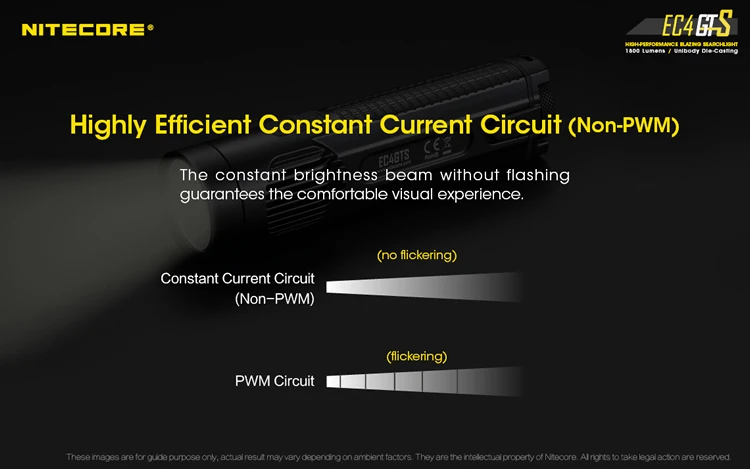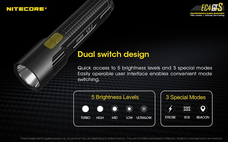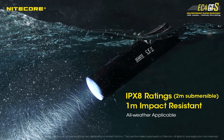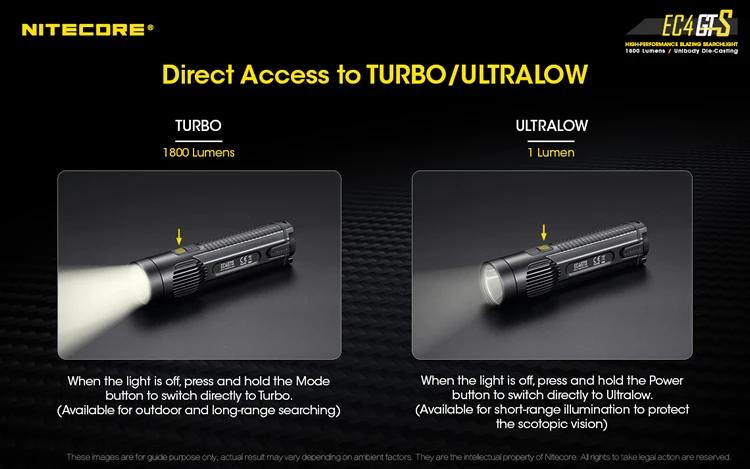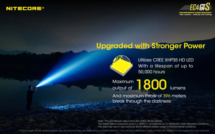 The Nitecore EC4GTS searchlight is the new-and-improved version of the EC4GT. This hand-held light features all of the same great features, including the unibody die-cast construction, easy-to-use dual button side switches, as well as the same great comfortable grip. This hand-held light was simply upgraded with a new Cree XHP35 HD LED and a brighter lumen output than its predecessor. This new LED flashlight now offers an 1800-lumen Turbo mode. That’s 800 lumens brighter than the EC4GT!