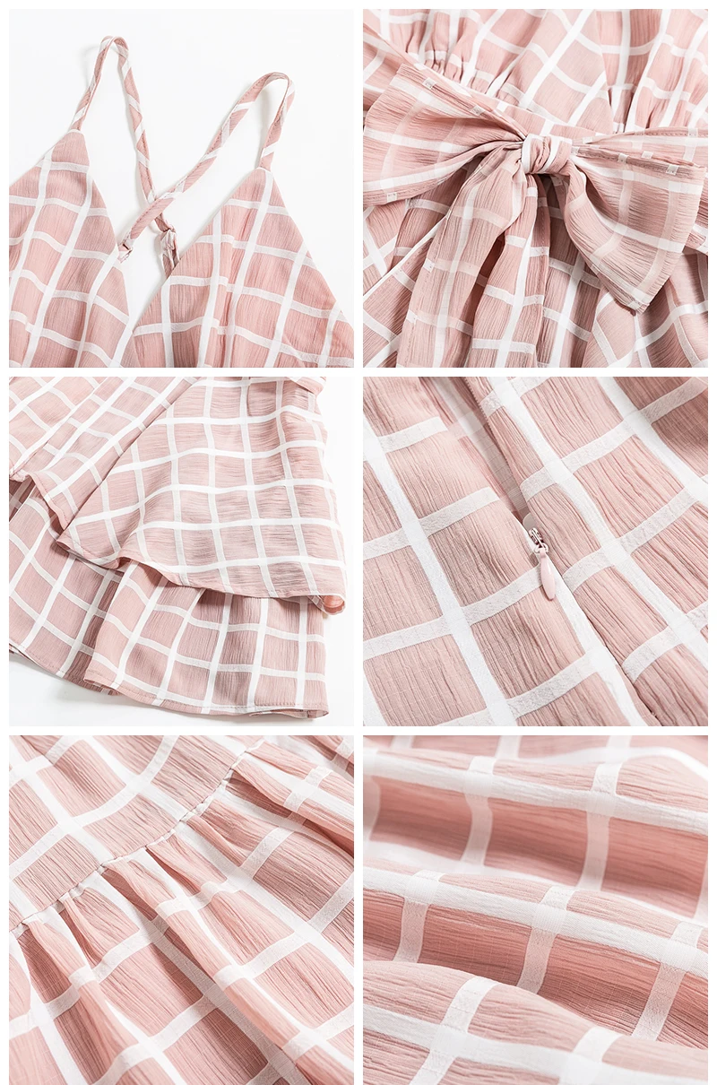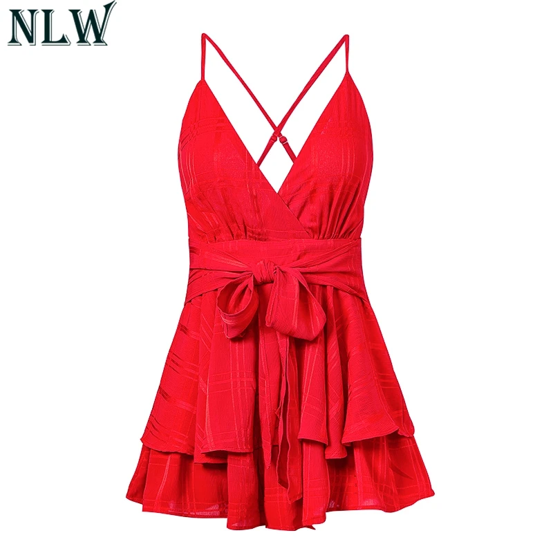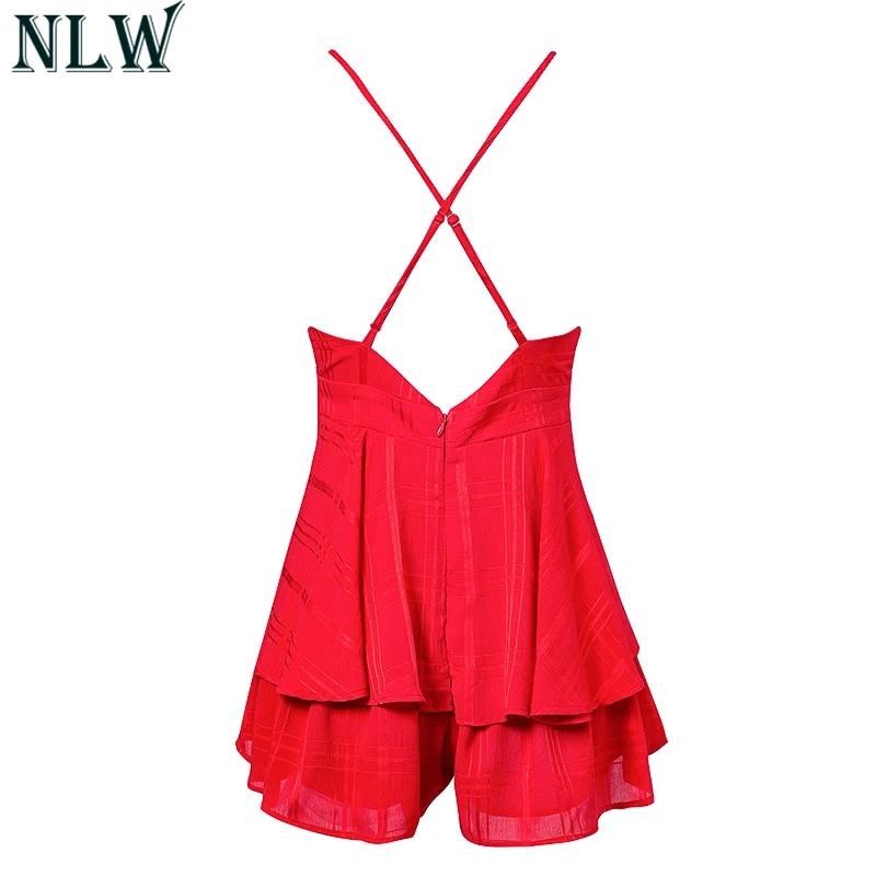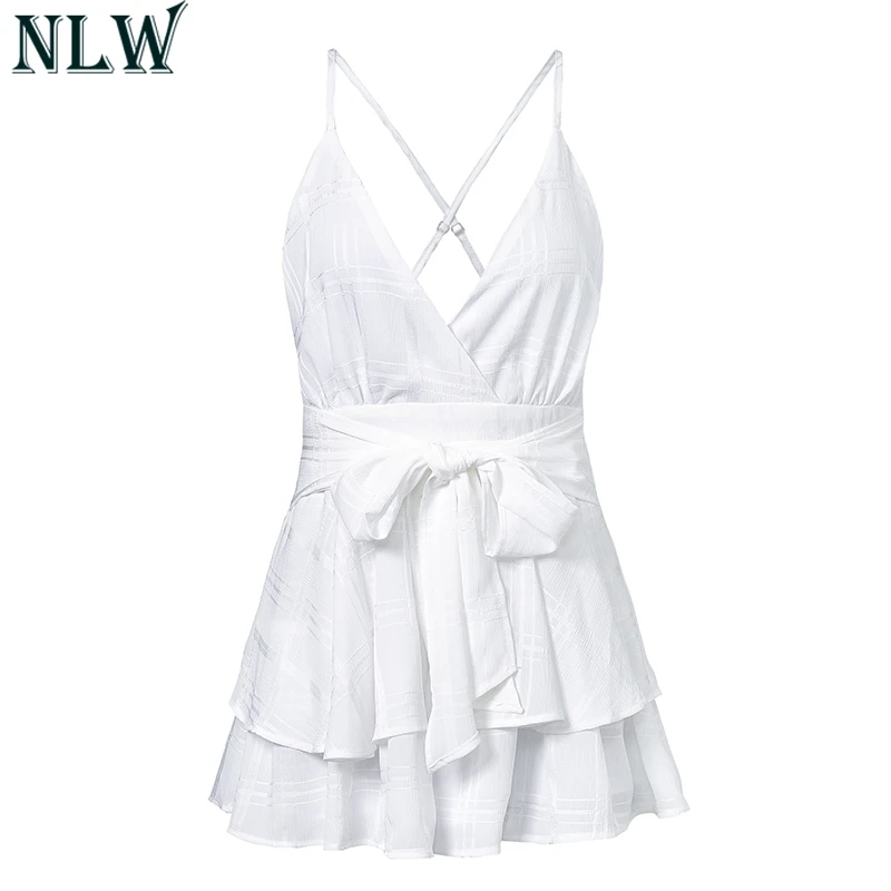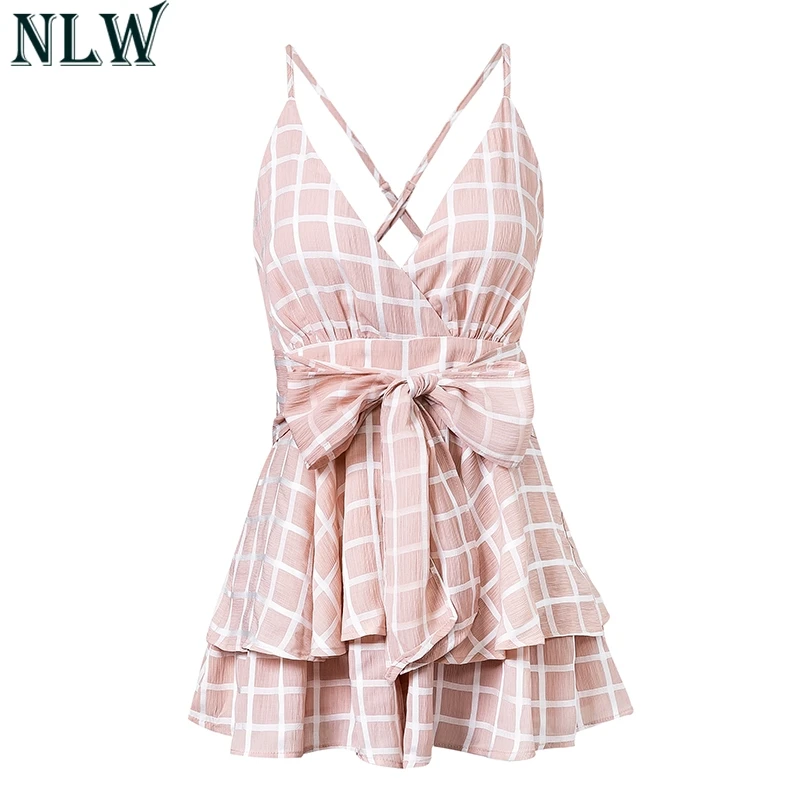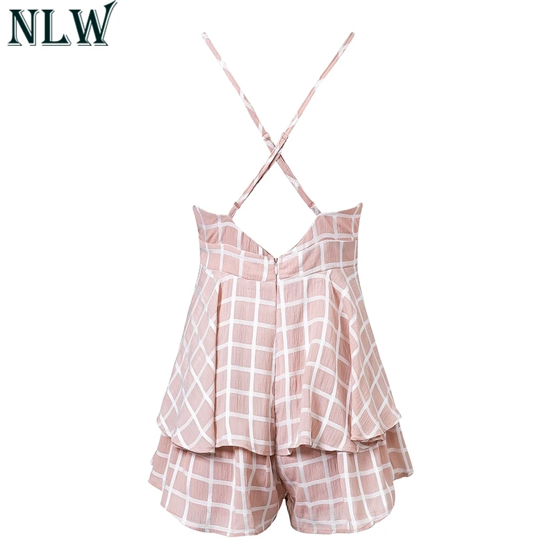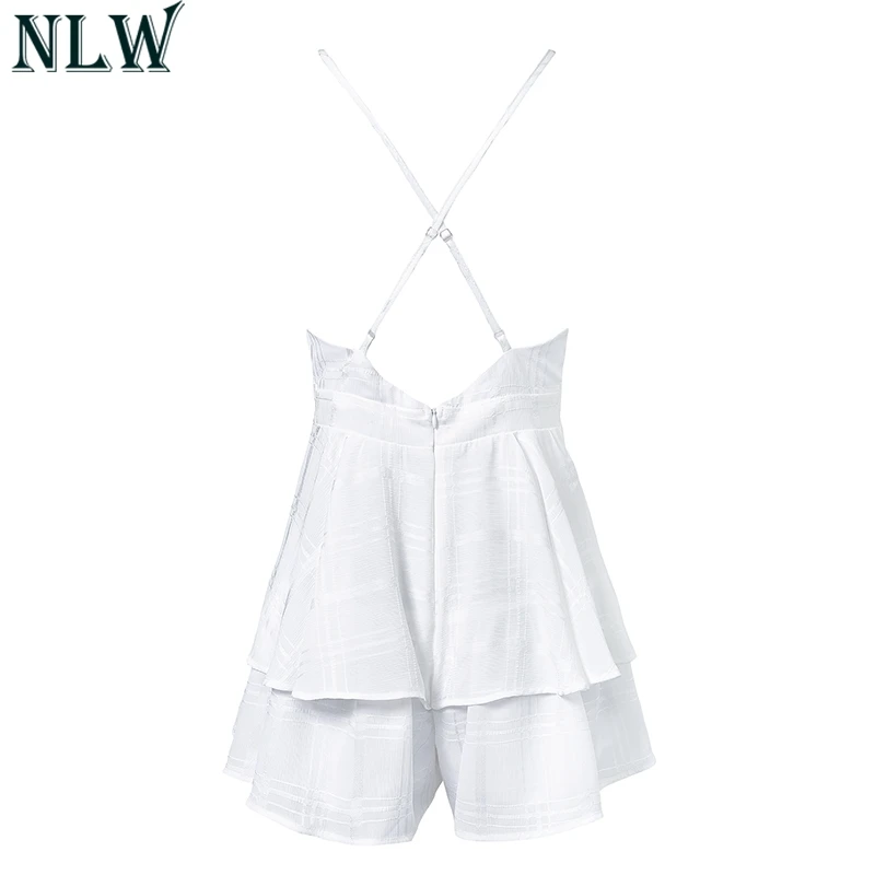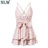 NLW White Ruffle Plaid Jumpsuits Rompers Spaghetti Strap Cross Back Bow Tie Waist Skorts Playsuit Girl Summer Beach Overalls