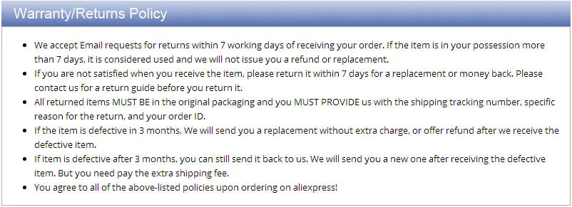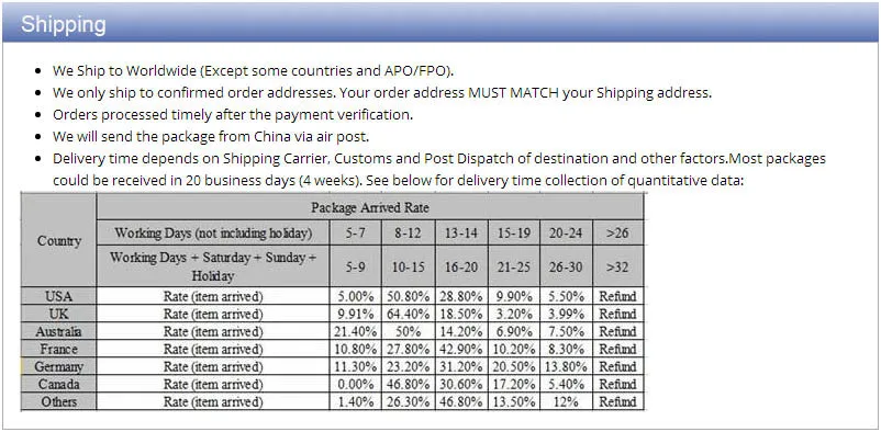 • If you did not receive the product within the guaranteed time( 45 days not including 2-5 day processing) you can request a refund or a reshipment.