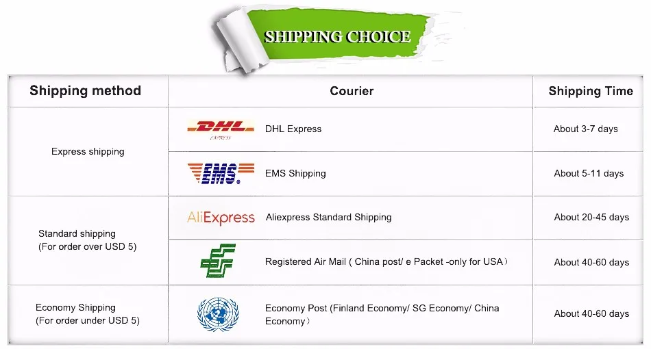 Packages from our warehouse in China will be shipped by ePacket or EMS depending on the weight and size of the product. Packages shipped from our US warehouse are shipped through USPS.