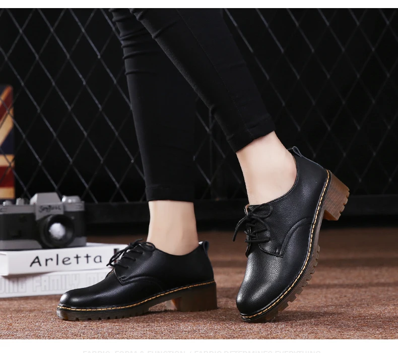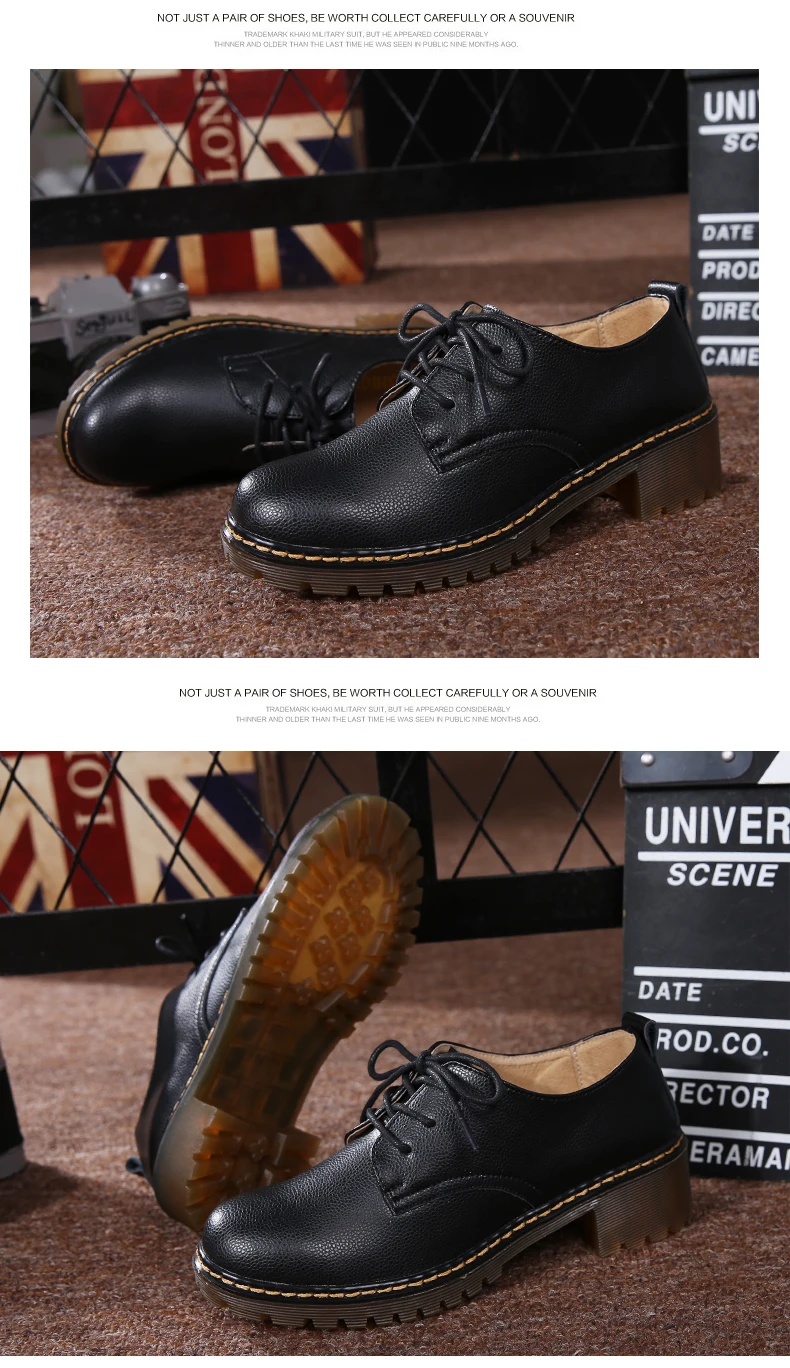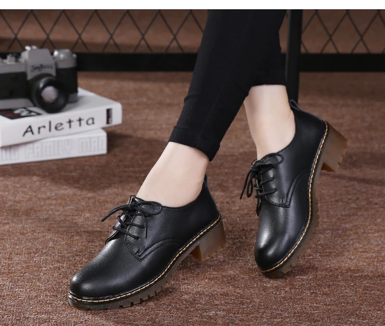 O16U Classic oxfords flats shoes women round toe rubber squared heel moccains shoes black Leather Lace up creepers shoes Spring