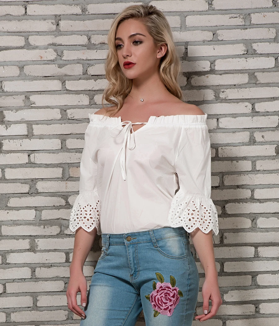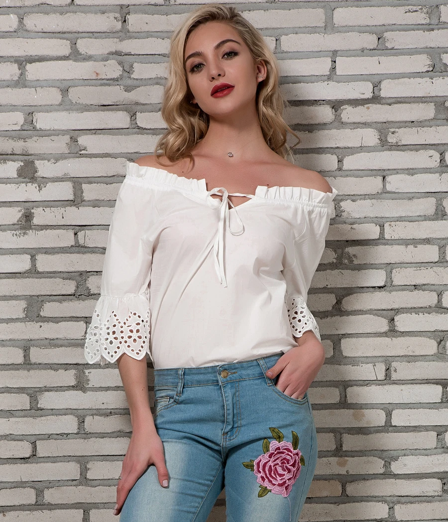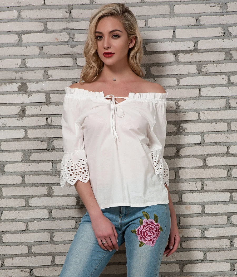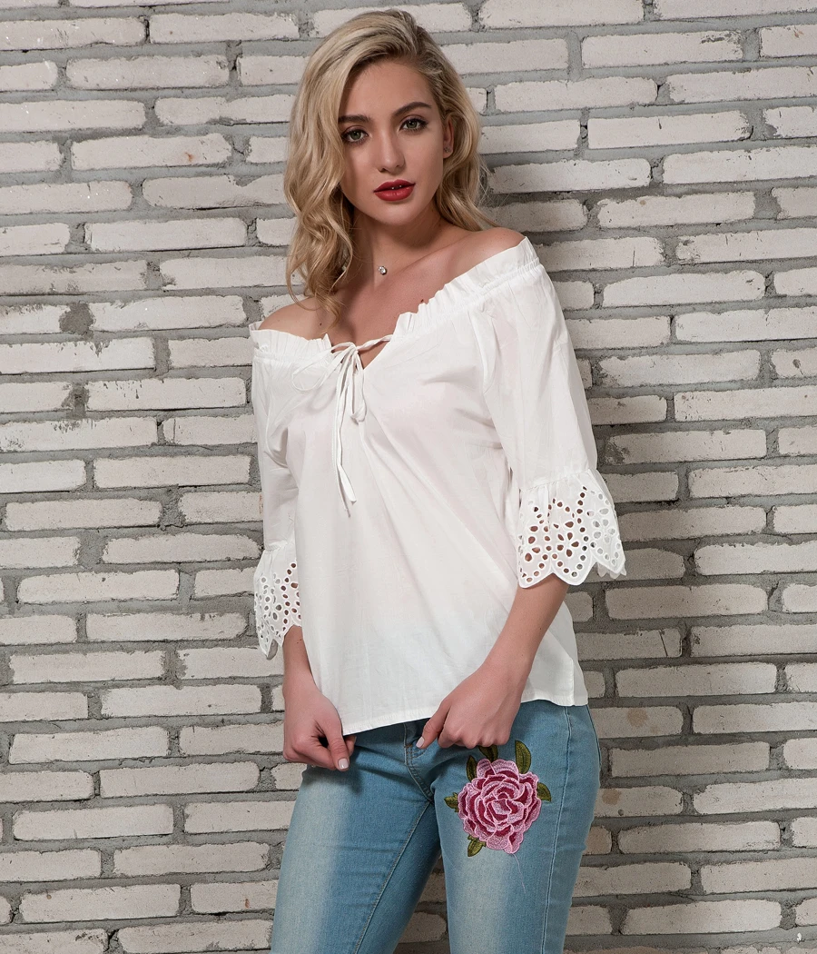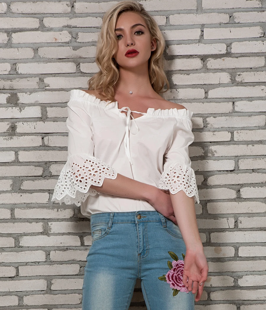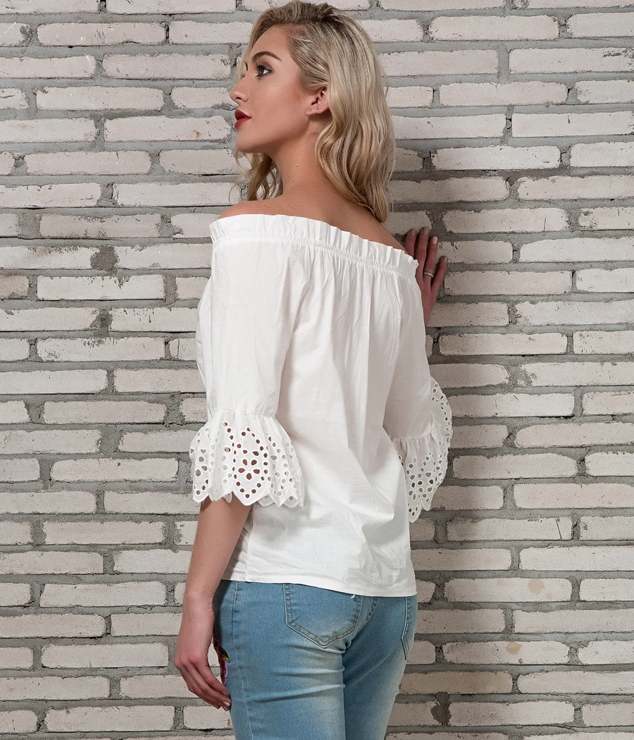 Off Shoulder Blouses Women 2018 Summer New Fashion Hollow Out Fare Long Sleeve Tops Ladies Streetwear Slash neck Blouse White