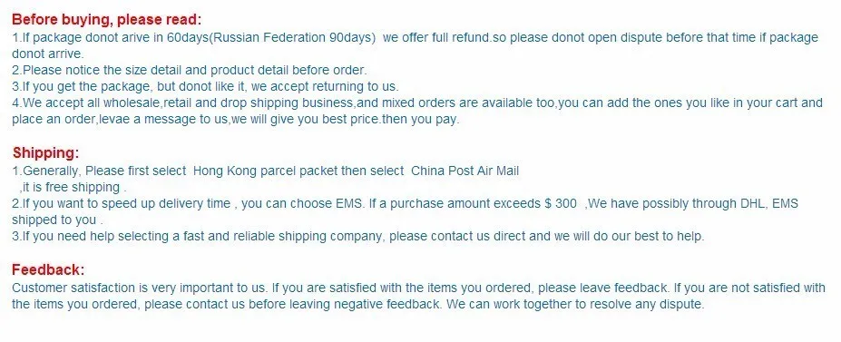 • If you did not receive the product within the guaranteed time( 45 days not including 2-5 day processing) you can request a refund or a reshipment.