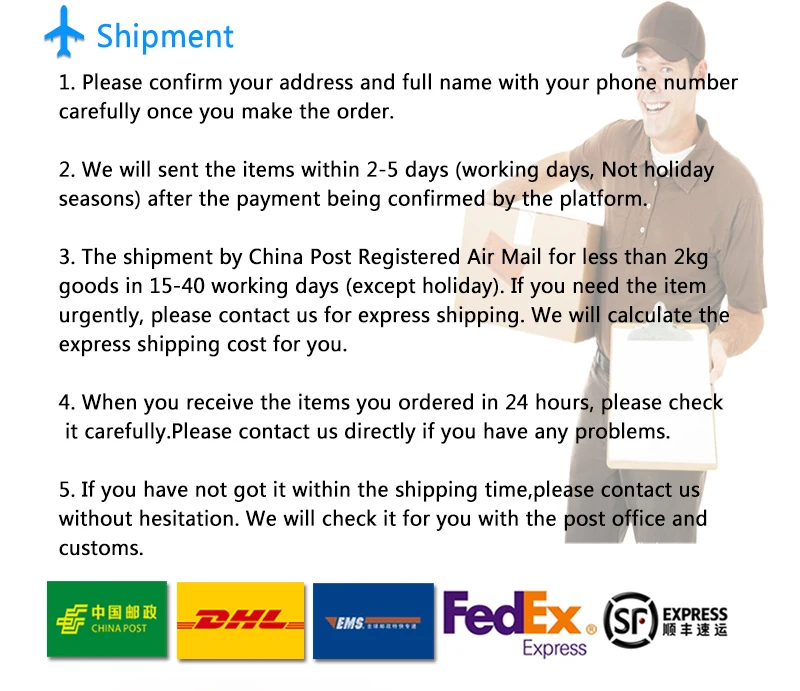Packages from our warehouse in China will be shipped by ePacket or EMS depending on the weight and size of the product. Packages shipped from our US warehouse are shipped through USPS.