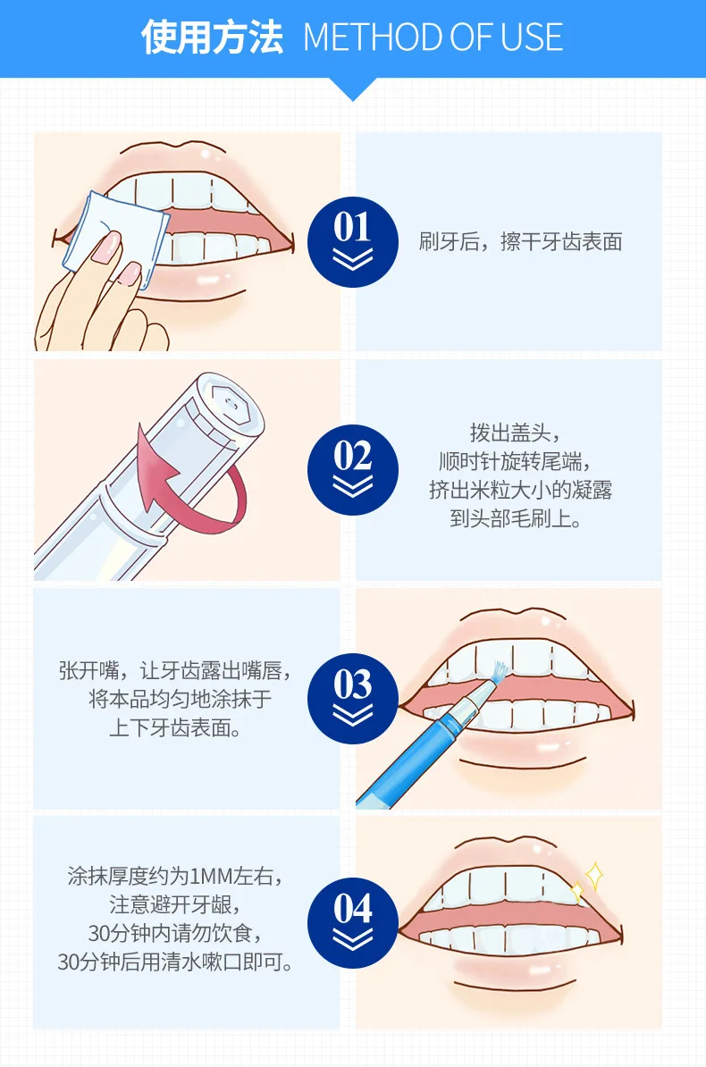 4.Smearing thickness is around 1mm over the teeth,please note avoid touch the gums,after smearing,please do not eat or drink within 30 minutes,finally gargle with clean water after 30 minutes