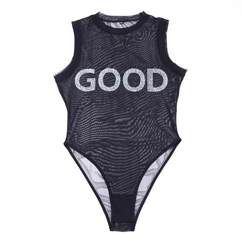 Onlyoung 2017 Summer Women Sexy Bodysuit Transparent Sleeveless Diamond Sequin Black Mesh Jumpsuit