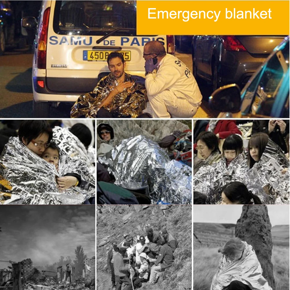 emergency blanket (thickness 0.0026CM, aluminized film; unfolded size 210*130 cm / 82.68 * 51.18”, folded size 14*8*3 cm / 5.51 * 3.15 * 1.18”)